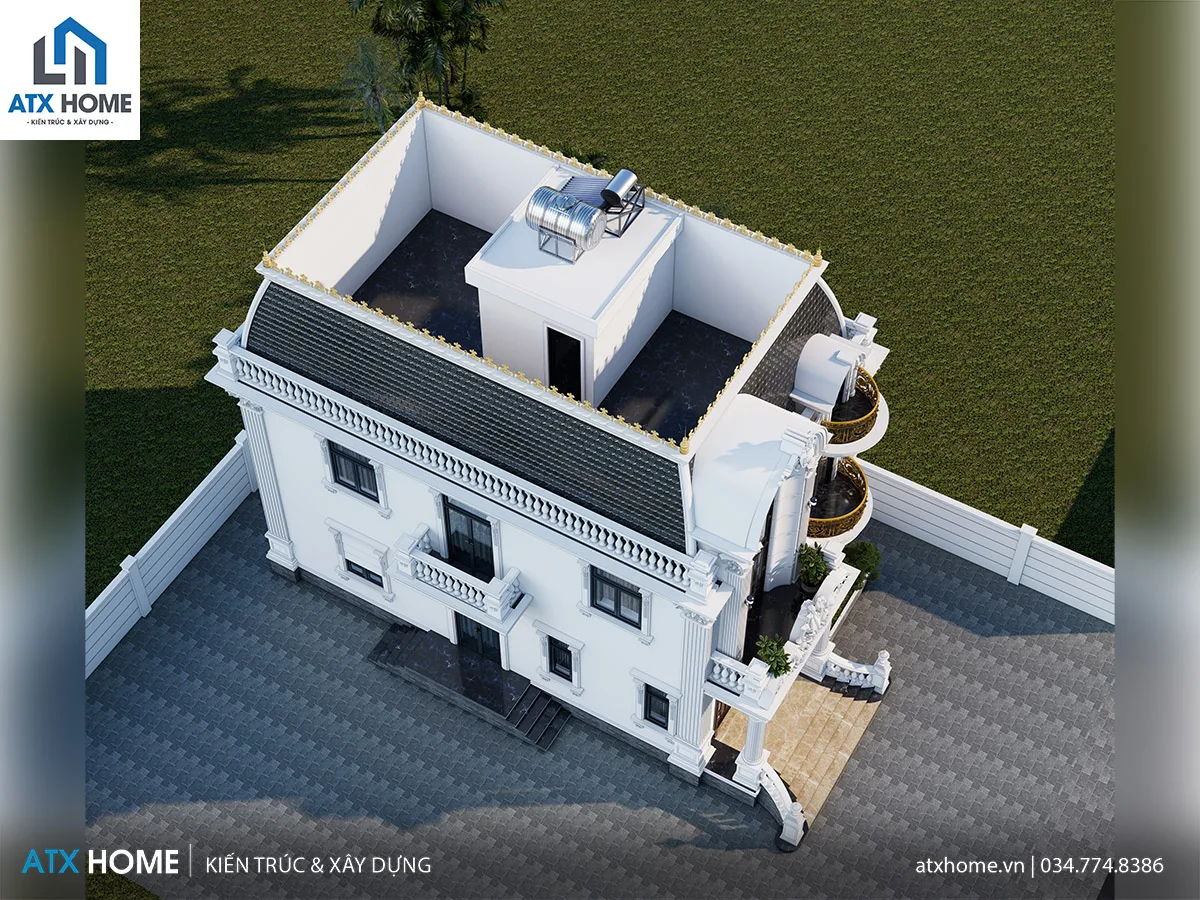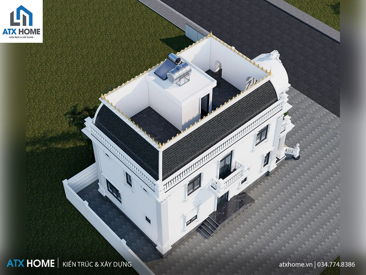 Mái Mansard tạo hình khối cao ráo và sang trọng hơn so với mái bằng hay mái dốc truyền thống, đặc biệt phù hợp với kiến trúc Châu Âu. Khoảng không phía trong mái có thể tận dụng làm kho, phòng kỹ thuật hoặc không gian phụ, giúp tối ưu diện tích sử dụng.