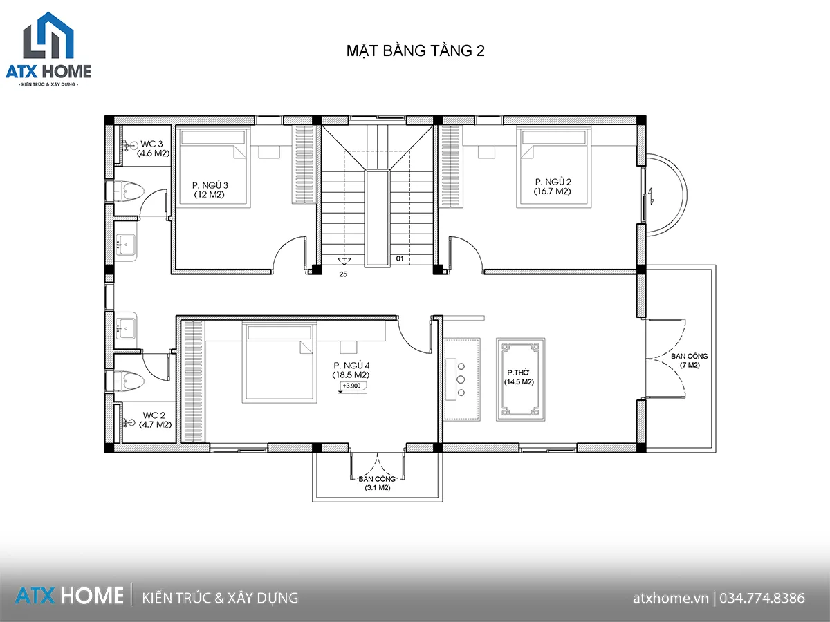 Tầng 2: 2 phòng ngủ, 1 phòng thờ, có ban công lấy sáng và thông gió. Phòng ngủ lớn có không gian lưu trữ tốt, phù hợp vợ chồng gia chủ.
