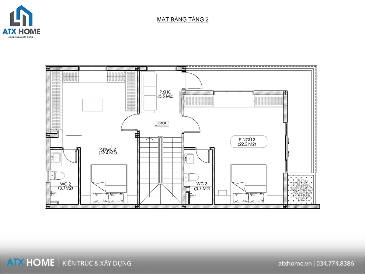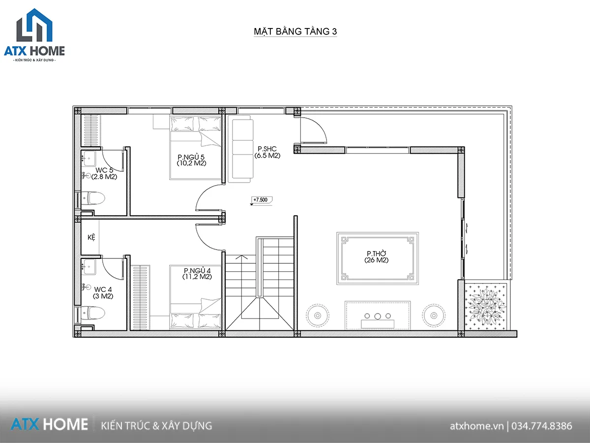 Tầng 3 là nơi thể hiện sự chỉn chu trong thiết kế với phòng thờ rộng 26m² đặt ở vị trí cao nhất, trang trọng và hợp phong thủy. Cùng với đó là hai phòng ngủ phụ, khu sinh hoạt chung và sân phơi gọn gàng, đáp ứng đầy đủ nhu cầu sinh hoạt hàng ngày.