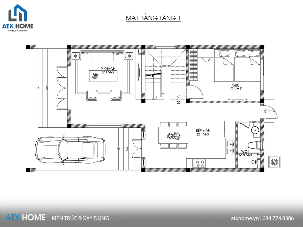 Tầng 1 được thiết kế mở, kết nối phòng khách 20m² và bếp ăn 21m² giúp tối ưu diện tích và tăng sự tương tác giữa các thành viên. Phòng ngủ nhỏ 14m² thuận tiện cho người lớn tuổi hoặc khách đến chơi ở lại. Phần sân trước có gara ô tô riêng biệt, thể hiện sự tính toán kỹ lưỡng về công năng sử dụng thực tế.