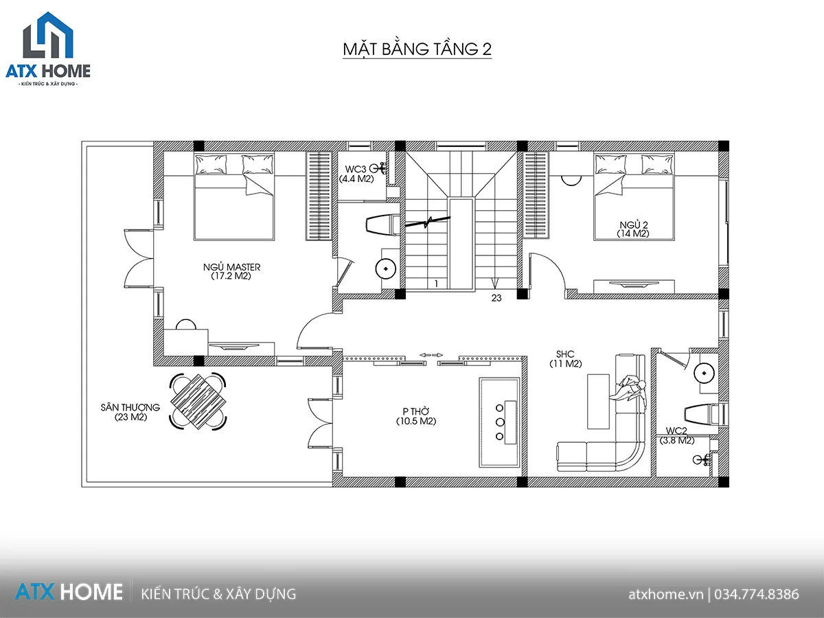 Tầng 2 gồm phòng ngủ master 17m² có lối ra sân thượng rộng 23m², cùng phòng ngủ phụ 14m² và phòng thờ 10m² được bố trí hợp phong thủy. Ngoài ra, phòng sinh hoạt chung 11m² giúp gia đình có thêm không gian kết nối, thư giãn vào buổi tối.