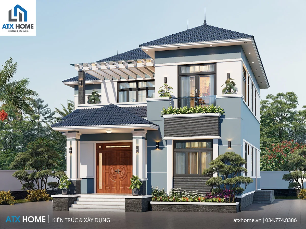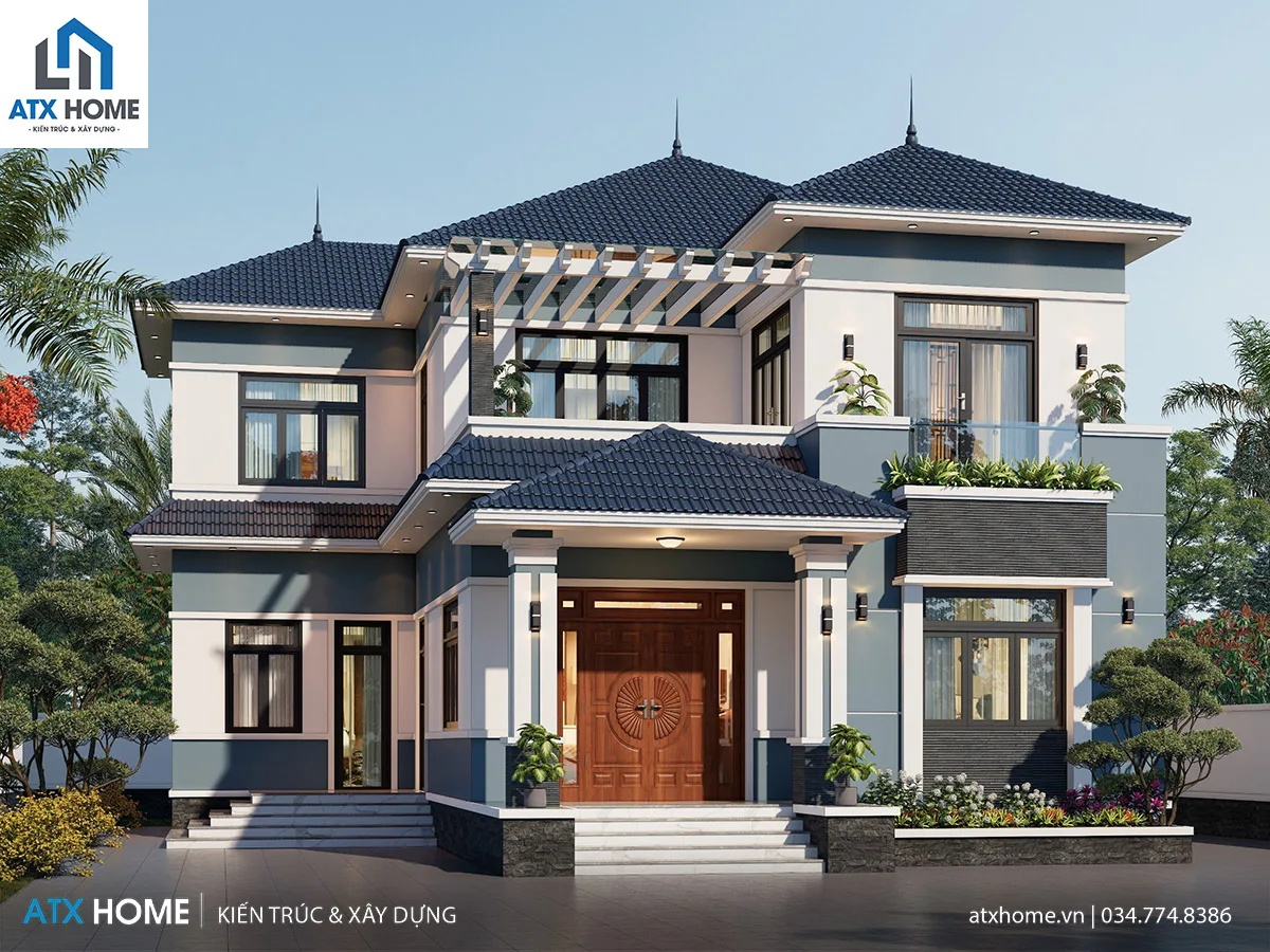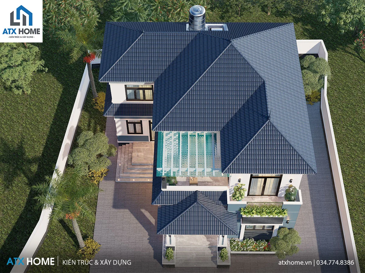 Công trình sử dụng mái Nhật xanh lam có độ dốc vừa phải, được thi công tỉ mỉ với phần viền đua rộng giúp thoát nước nhanh và bảo vệ tường hiệu quả. Kiểu mái này mang đến vẻ đẹp cân đối, thanh thoát và phù hợp khí hậu Việt Nam.