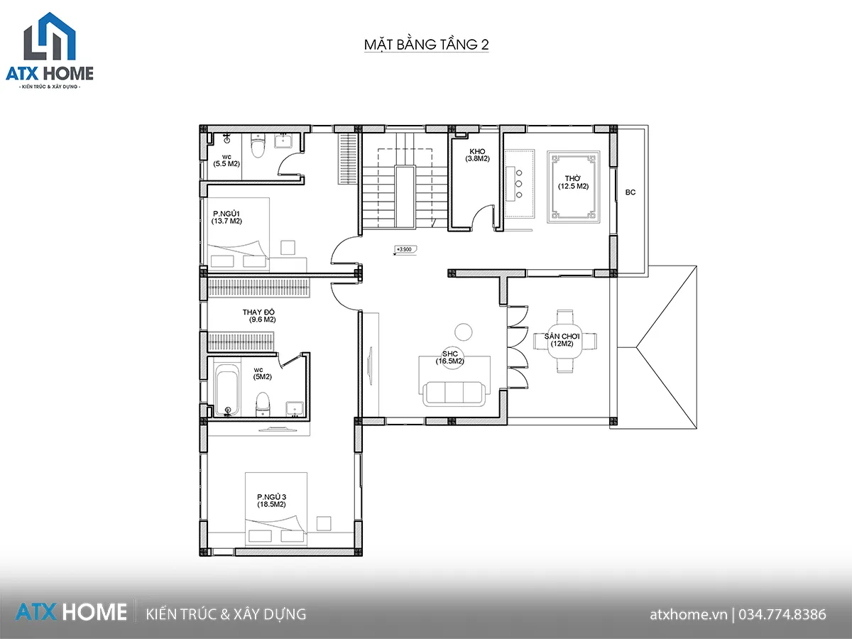 Phòng thờ (12.5m²): đặt hướng ra ban công, đảm bảo trang nghiêm và thông thoáng.