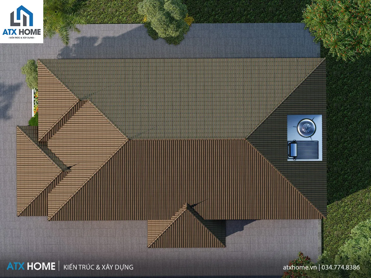 Công trình gây ấn tượng với kiến trúc mái Nhật màu nâu trầm – gam màu gợi cảm giác ấm áp, bền vững và sang trọng. Hệ mái được thiết kế giật cấp mềm mại, giúp ngôi nhà trở nên cân đối và thanh thoát hơn.