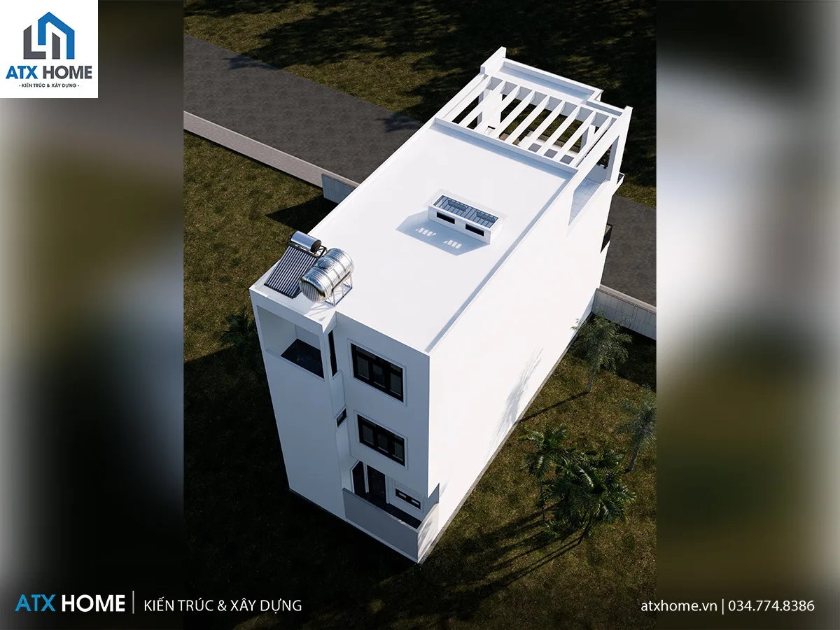 Tầng mái được xử lý chống thấm kỹ lưỡng, có bố trí bồn nước, năng lượng mặt trời gọn gàng. Sân thượng có lam chắn sáng vừa đảm bảo thẩm mỹ, vừa là không gian thư giãn nhẹ cho gia đình.