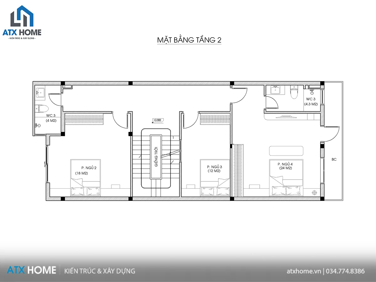 3 phòng ngủ phân theo hai bên thang, mỗi phòng đều có cửa sổ lấy sáng. Trong đó phòng ngủ 4 rộng rãi nhất và có WC khép kín thuận tiện.