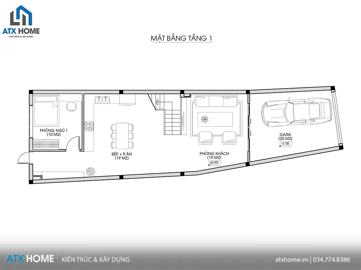 Tầng 1 – Không gian sinh hoạt chung và gara để xe
