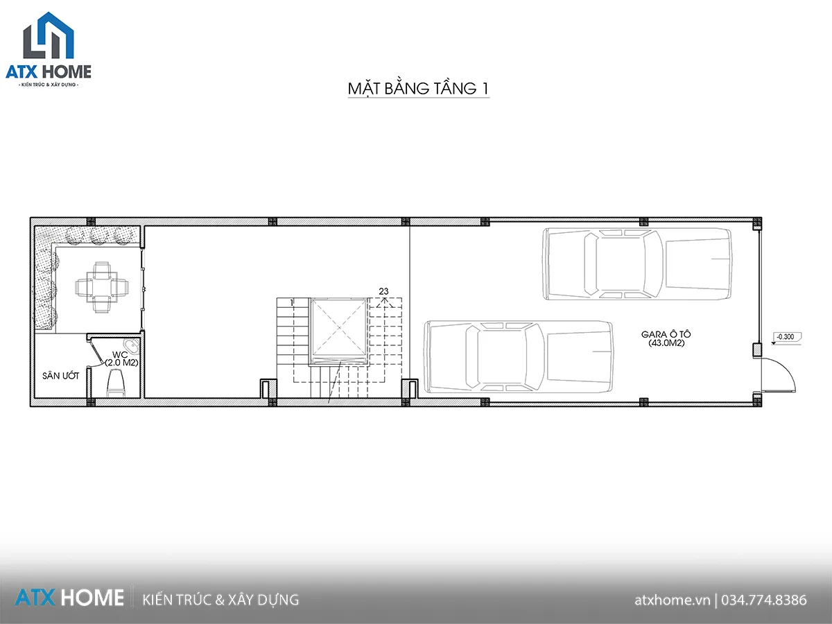 Toàn bộ tầng 1 được thiết kế làm gara ô tô rộng 43m², đủ chỗ cho 2 xe. Phía sau là khu sân ướt và WC nhỏ, tiện cho việc rửa xe hoặc sinh hoạt ngoài trời.