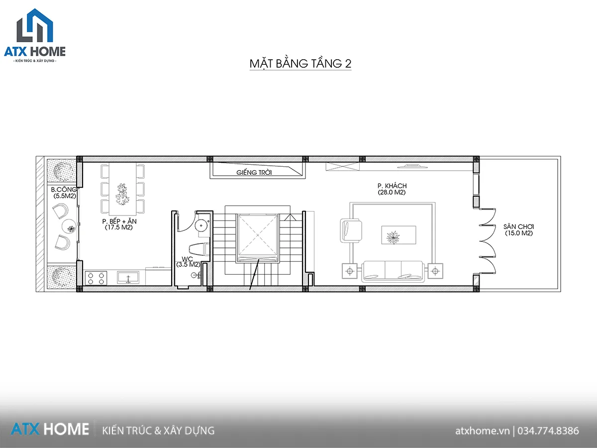 Tầng 2 bố trí phòng khách lớn 28m² liên thông với bếp + ăn 17,5m², tạo cảm giác thoáng mở. Phía trước và sau nhà đều có ban công và sân chơi, giúp lấy sáng và gió tự nhiên, đồng thời tạo khoảng nghỉ thư giãn cho các thành viên.
