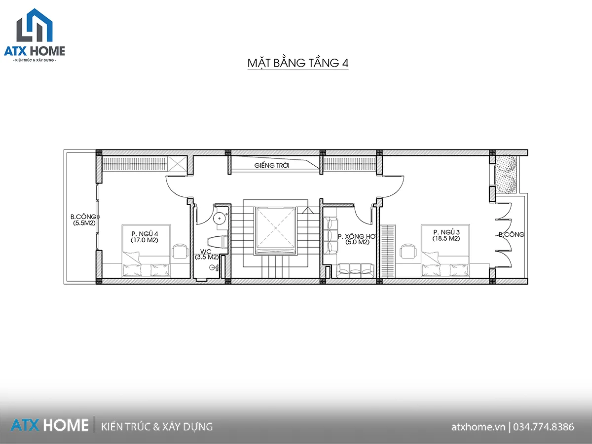 Hai tầng này được bố trí 4 phòng ngủ rộng rãi. Tầng 3 mỗi phòng đều có WC riêng và ban công. Tầng 4 có 2 phòng ngủ và còn được tích hợp thêm phòng xông hơi, giúp gia chủ thư giãn sau ngày dài làm việc – một tiện ích hiếm thấy ở nhà phố hiện nay.