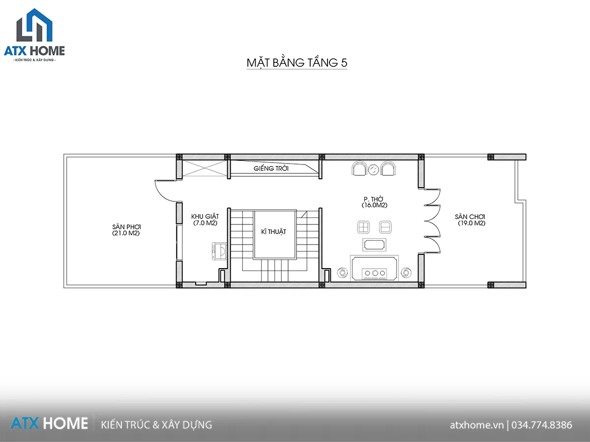 Trên cùng là phòng thờ 16m², đặt ở vị trí cao và thông thoáng. Phía sau là sân phơi – khu giặt, phía trước là sân chơi 19m², nơi cả gia đình có thể trồng cây hoặc ngắm cảnh thành phố.