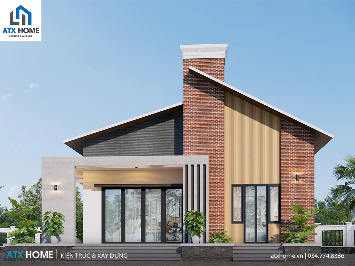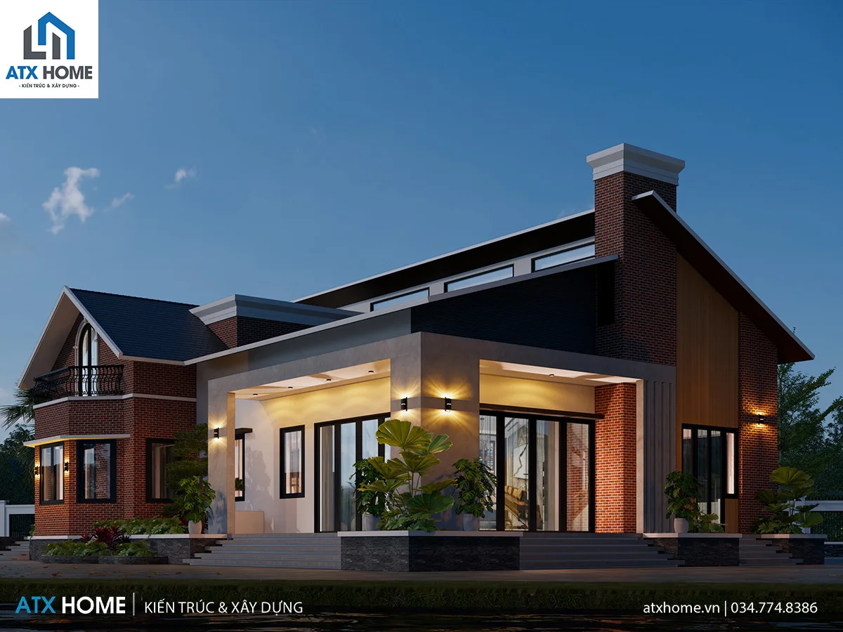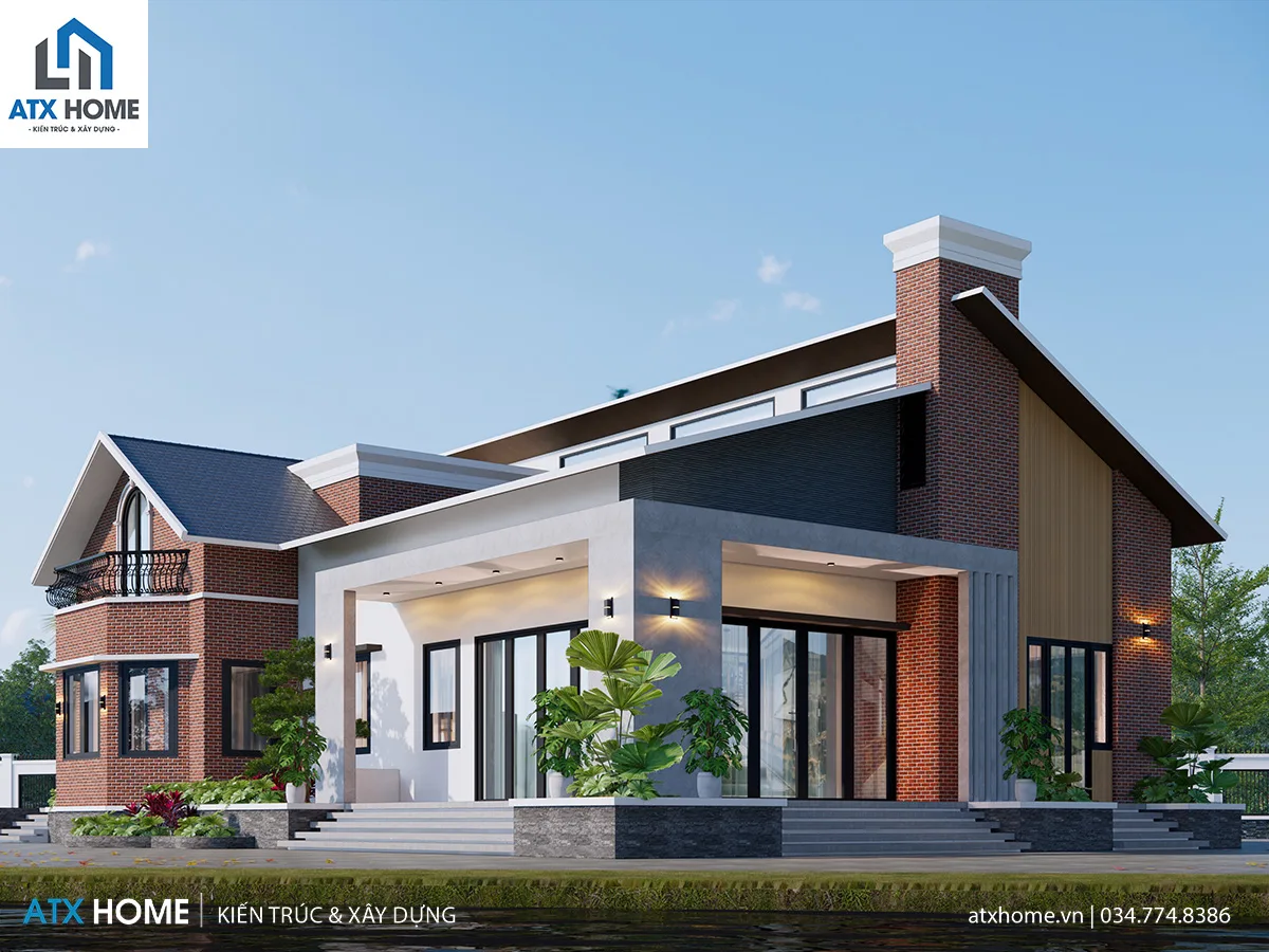 Điểm đặc sắc của công trình là mái lệch có biên độ cao – thấp tạo cảm giác chuyển động. Vật liệu được phối hợp đa dạng nhưng tinh tế: gạch đỏ – lam gỗ – kính panorama – ốp đá. Hiên trước mở rộng giúp công trình bề thế mà không hề nặng nề.
