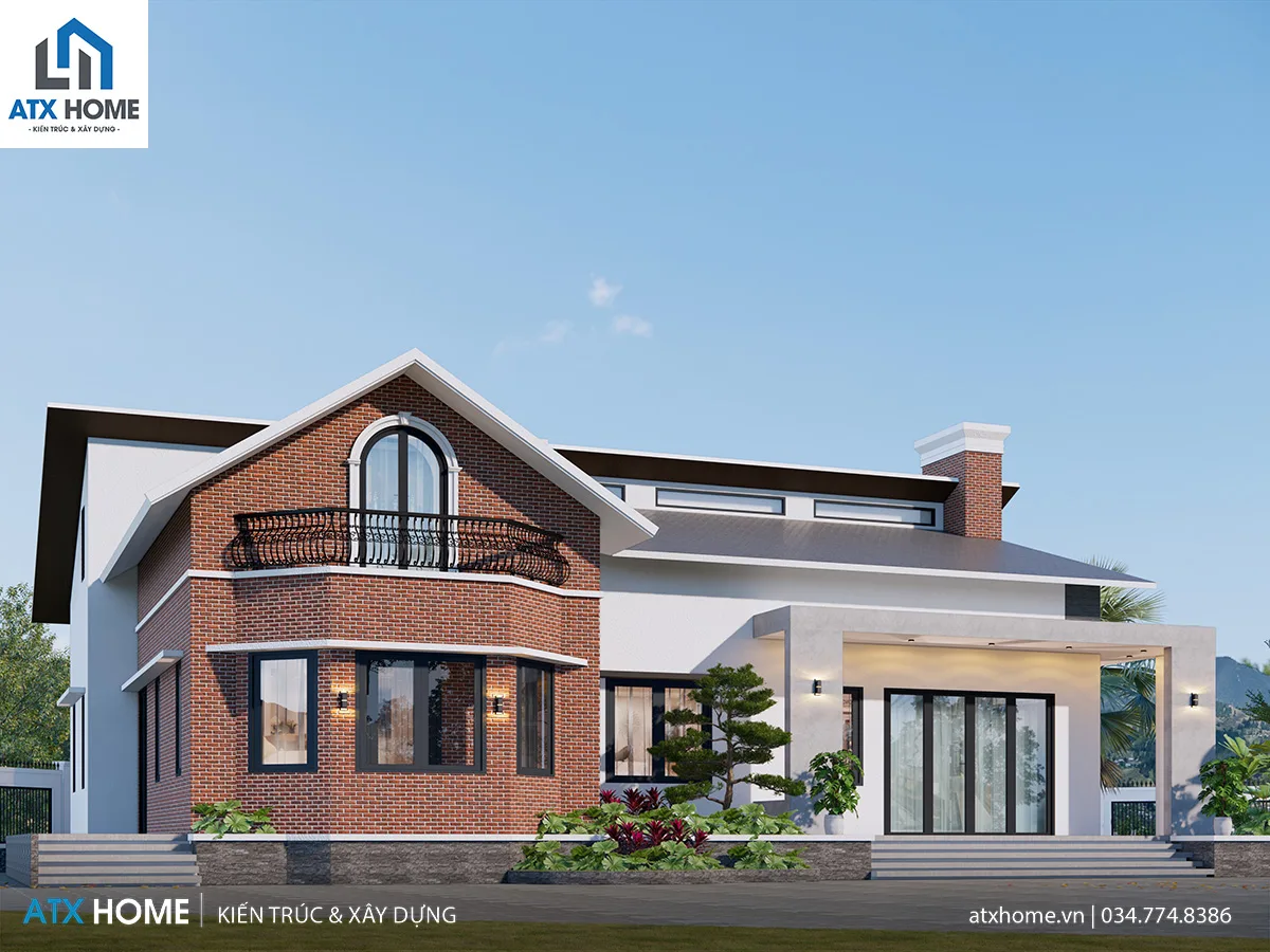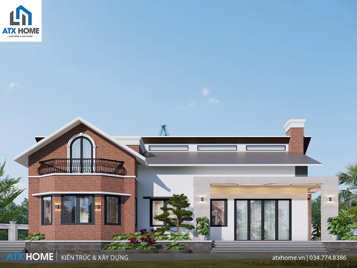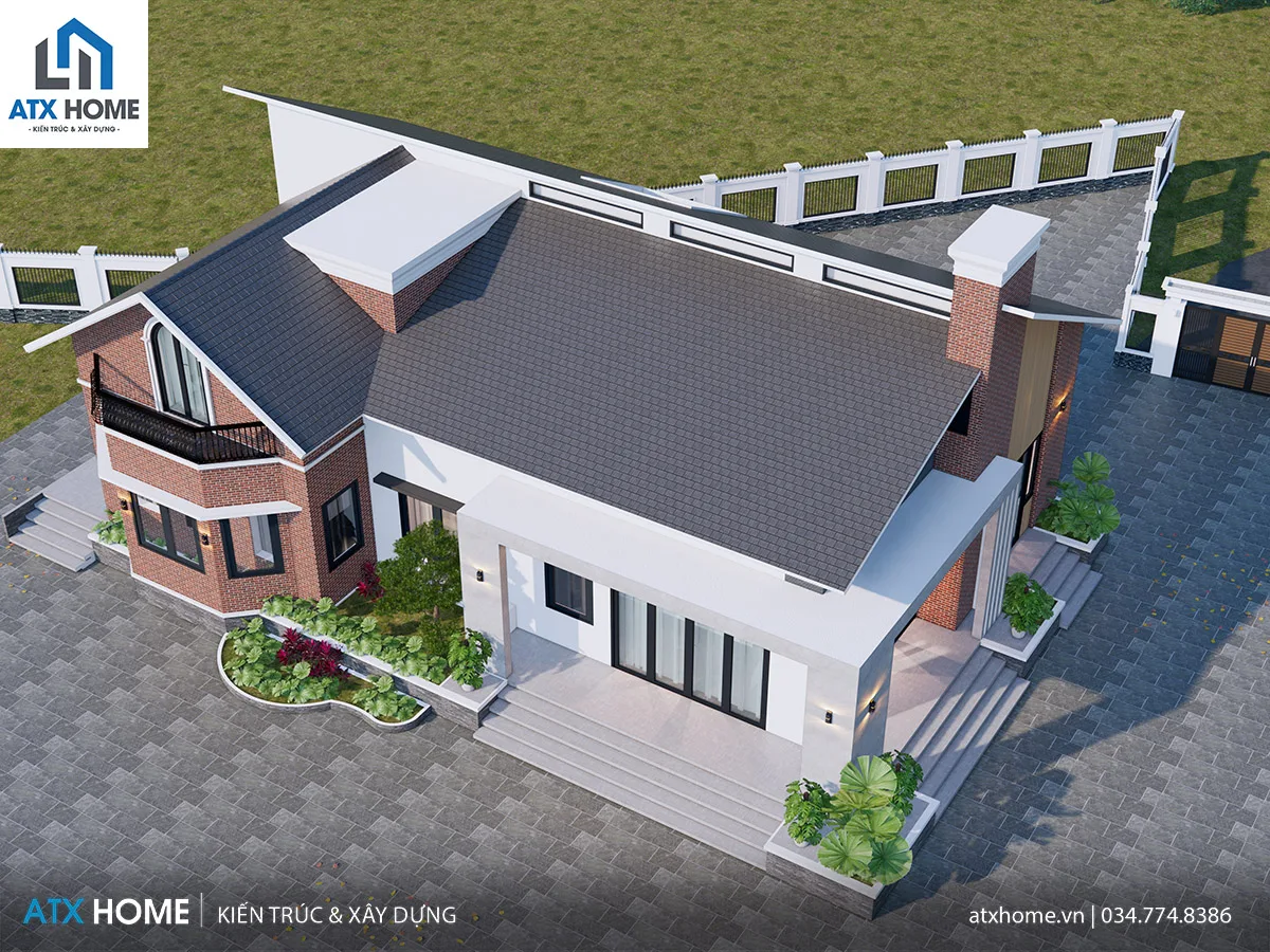 Điểm đặc sắc của công trình là mái lệch có biên độ cao – thấp tạo cảm giác chuyển động. Vật liệu được phối hợp đa dạng nhưng tinh tế: gạch đỏ – lam gỗ – kính panorama – ốp đá. Hiên trước mở rộng giúp công trình bề thế mà không hề nặng nề.