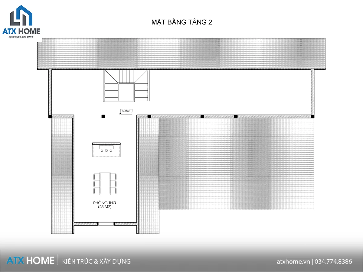 Tầng 2: một phòng thờ 25 m² nằm tách biệt trang nghiêm, kết hợp khoảng thông tầng lấy sáng và đối lưu khí.