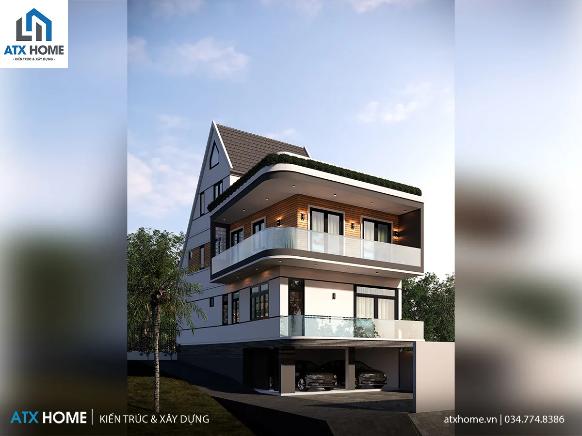 Công trình đi theo định hướng hiện đại – tối giản, tập trung vào hình khối vuông gọn, mặt đứng thoáng, mảng kính lớn và các đường ốp gỗ trang trí giúp công trình vừa ấm, vừa sang. Điểm nhấn quan trọng là hệ mái lệch chạy dọc theo chiều đứng, tạo hiệu ứng thị giác mạnh, giúp ngôi nhà trông cao ráo hơn nhiều so với thực tế.