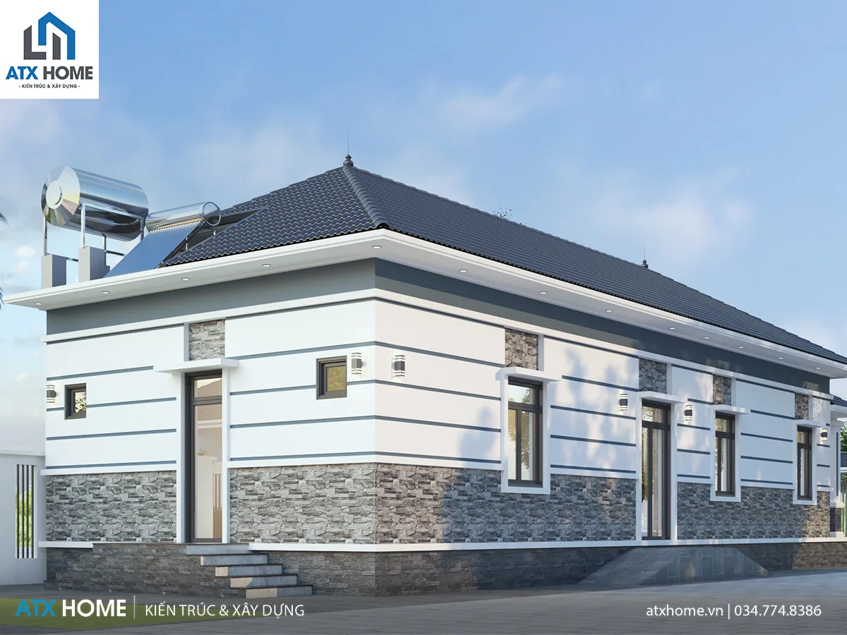 Ngôi nhà được thiết kế theo phong cách mái Nhật hiện đại với dáng mái thoải nhẹ, sử dụng hệ vì kèo thép lợp ngói màu xanh ghi giúp công trình vừa thanh thoát vừa sang trọng. Mái Nhật là lựa chọn lý tưởng cho khí hậu miền Trung, vừa thoát nước tốt vừa đảm bảo tính thẩm mỹ cao.