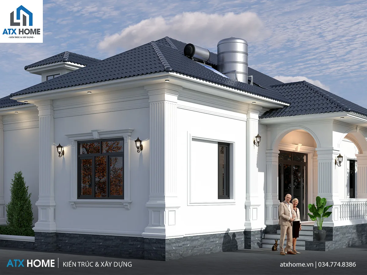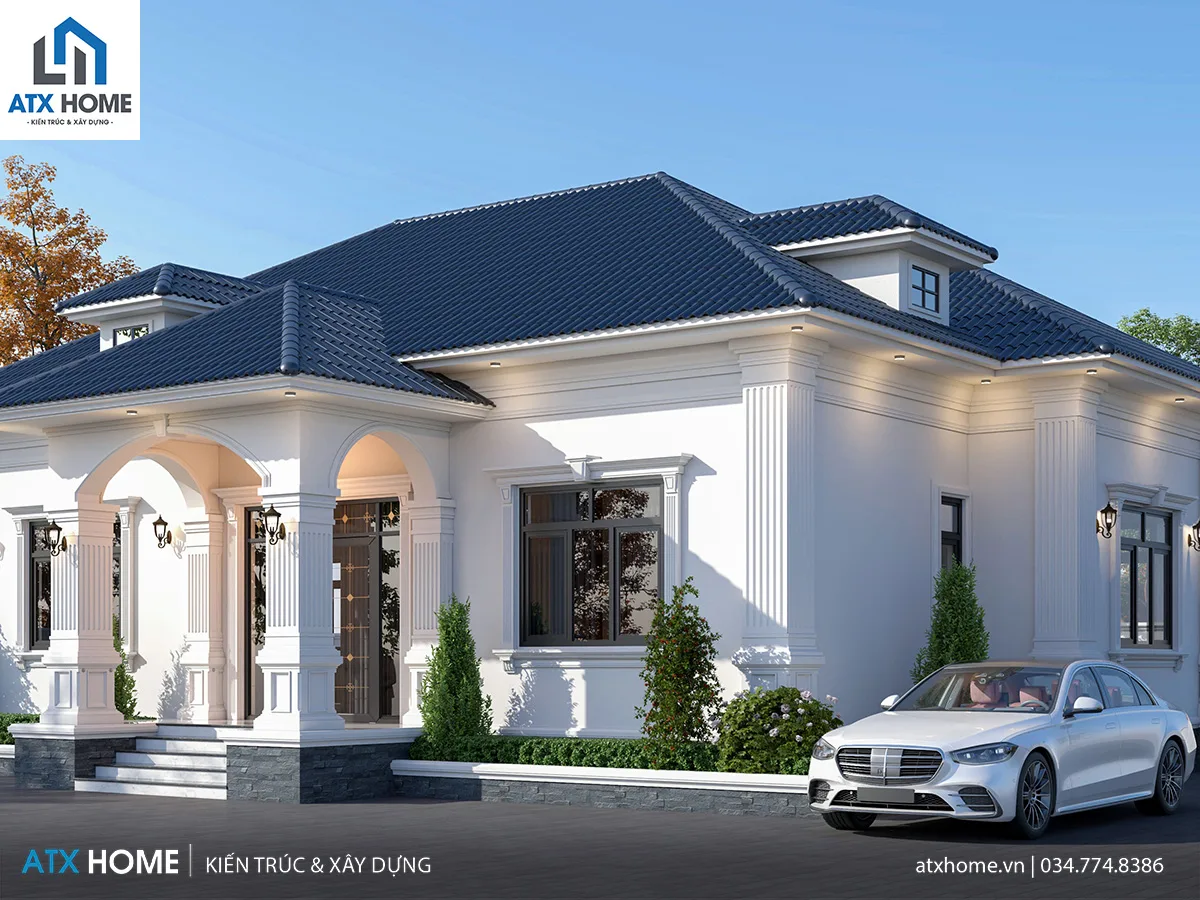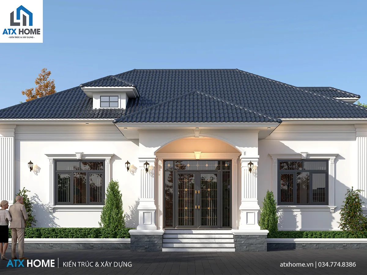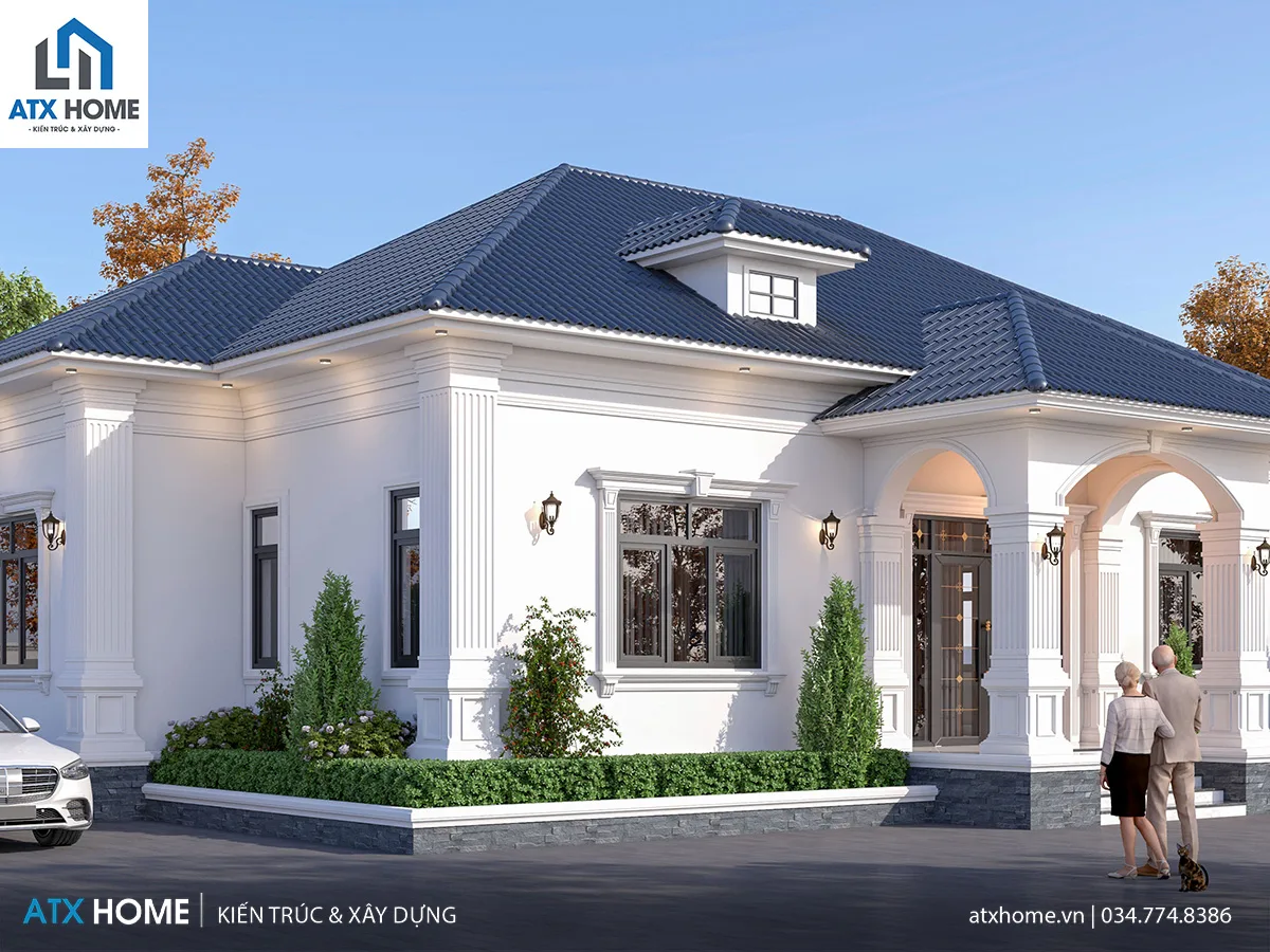 Ngôi nhà gây ấn tượng ngay từ cái nhìn đầu tiên bởi tổng thể cân đối, mái Nhật xanh đậm thanh thoát, cùng gam trắng tinh khôi làm nền cho những đường phào chỉ nhẹ. Hệ cột vuông lớn chạy dọc mặt tiền mang đến vẻ vững chãi, uy nghi mà không nặng nề, tôn lên nét đẹp tinh tế của kiến trúc tân cổ nhẹ nhàng.
