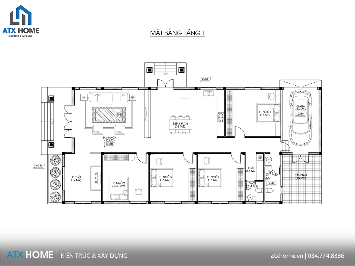 • Gara ô tô 16m² có lối ra sân sau riêng, đảm bảo giao thông tách biệt với khu sinh hoạt.