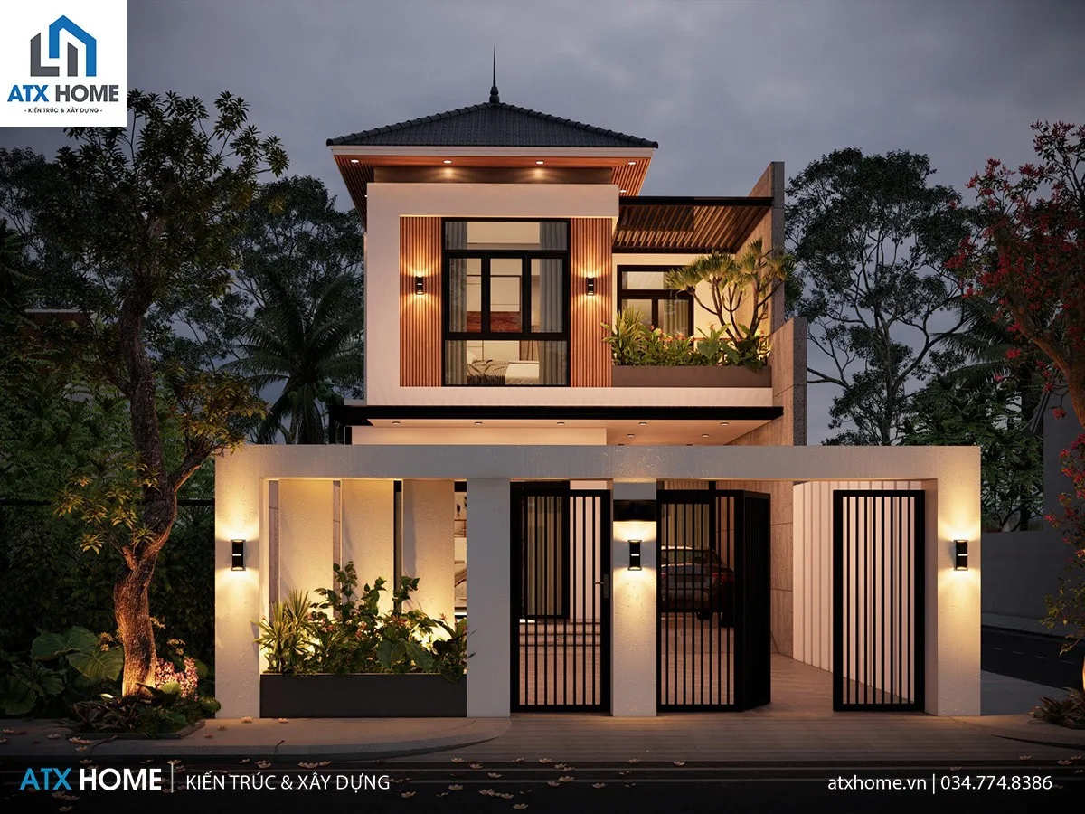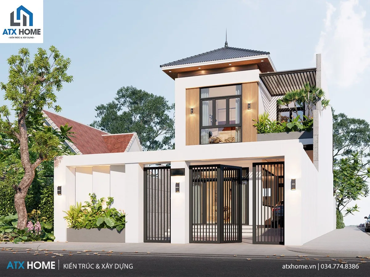 Công trình gây ấn tượng ngay từ ánh nhìn đầu tiên bởi sự cân bằng giữa hình khối hiện đại và chất Á Đông nhẹ nhàng. Tông trắng – nâu gỗ kết hợp cùng mái Nhật xanh đen thanh lịch tạo nên nét tinh tế, không cầu kỳ nhưng vẫn đầy điểm nhấn.
