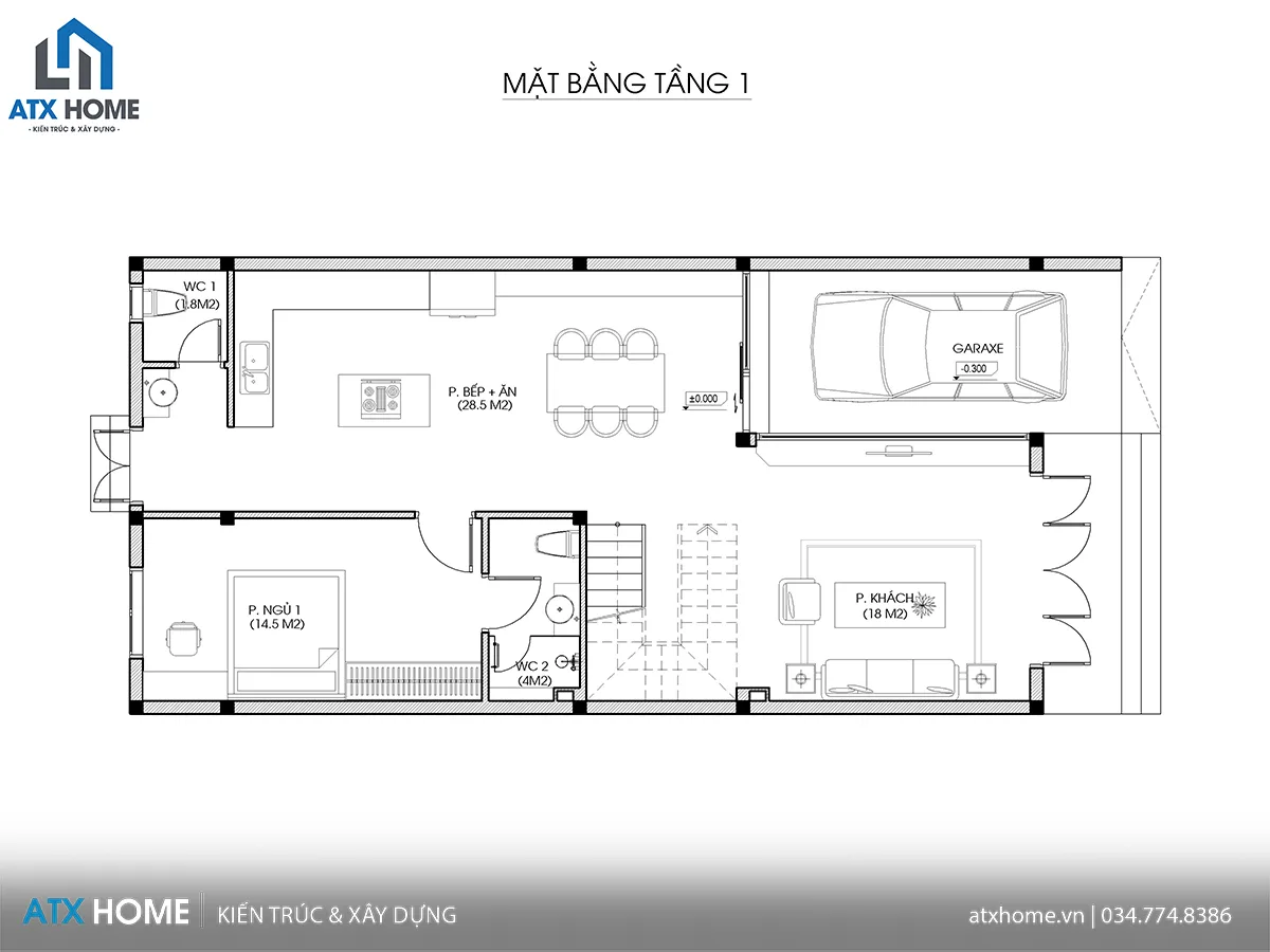 Bước vào nhà là phòng khách 18m², không gian nhỏ gọn nhưng nhờ cửa kính mặt tiền rộng nên luôn sáng và thoáng. Cầu thang được đặt gọn ở giữa, vừa chia tách hợp lý, vừa tạo điểm nhấn trung tâm.