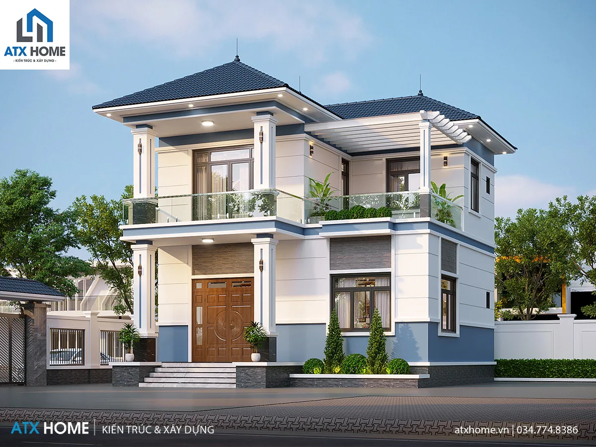 Hệ mái Nhật dốc nhẹ được thiết kế vươn rộng ra bốn phía, giúp che chắn tốt cho tường và cửa, đồng thời tạo cảm giác thanh thoát, vững chãi. Các đường phào chỉ kẻ ngang nhẹ nhàng cùng lan can kính cường lực trong suốt mang đến diện mạo trẻ trung, hiện đại.
