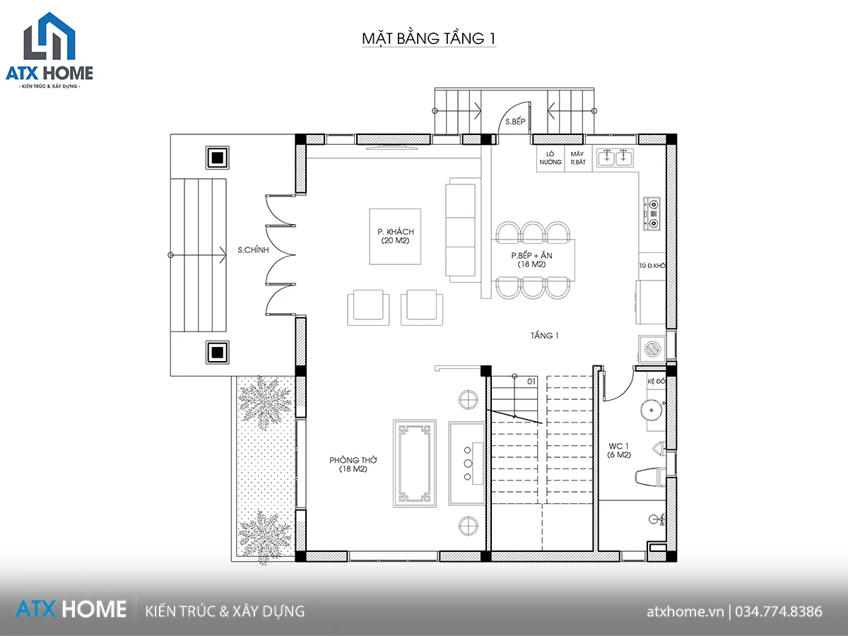 Từ sảnh chính bước vào là phòng khách 20m² – nơi tiếp đón khách và sum họp gia đình, được bố trí liên thông với phòng bếp + ăn 18m², tạo sự thông thoáng và kết nối không gian. Bên cạnh là phòng thờ 18m², đặt ở vị trí trang trọng, hướng nhìn ra mặt tiền vừa đảm bảo phong thủy, vừa thuận tiện cho việc hương khói.