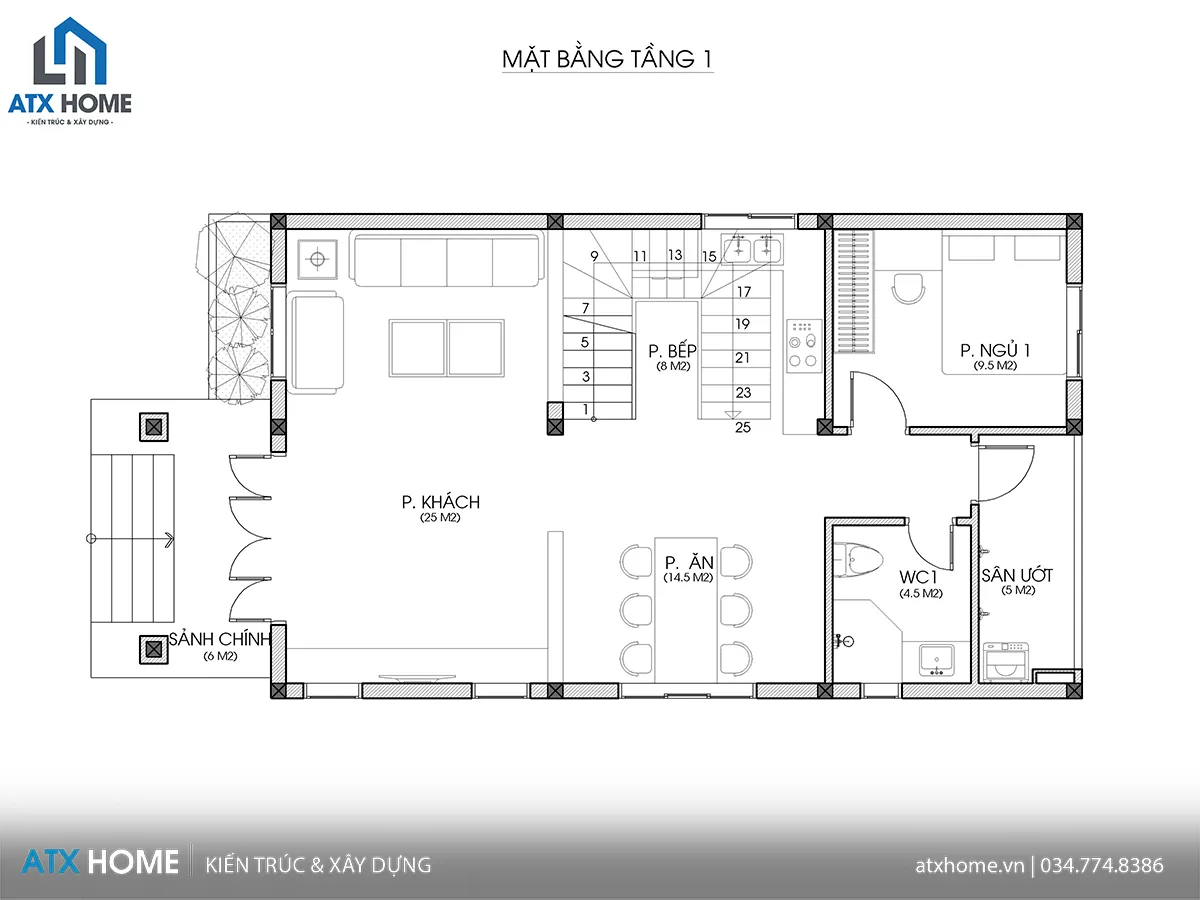 Từ sảnh chính bước vào là phòng khách rộng rãi lên tới 25 m² – khu vực trung tâm của ngôi nhà, nơi gia đình đón tiếp bạn bè, người thân. Kế bên là phòng bếp 8m² và khu ăn 14.5 m², liên kết mở giúp không gian thoáng đãng và thuận tiện di chuyển. Phía cuối nhà là phòng ngủ 9.5 m², phù hợp cho người lớn tuổi hoặc khách đến chơi. Ngoài ra, tầng một còn có WC 4.5 m² và sân ướt 5 m² thuận tiện cho giặt phơi, rửa rau và các công việc nội trợ.