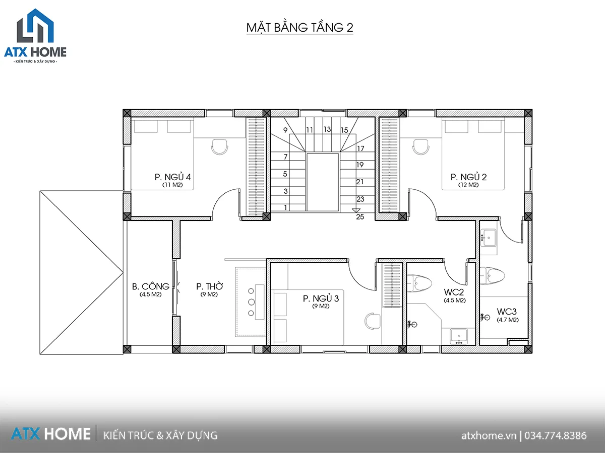 Tầng trên được bố trí 3 phòng ngủ, trong đó phòng ngủ lớn 12 m² có WC khép kín, hai phòng còn lại lần lượt 11 m² và 9 m², tạo sự riêng tư và thoải mái cho các thành viên. Phòng thờ 9 m² đặt vị trí trung tâm, hướng ra ban công 4.5 m², đảm bảo yếu tố phong thủy và sự tôn nghiêm. WC chung được bố trí khéo léo, tiện lợi cho sinh hoạt hàng ngày.
