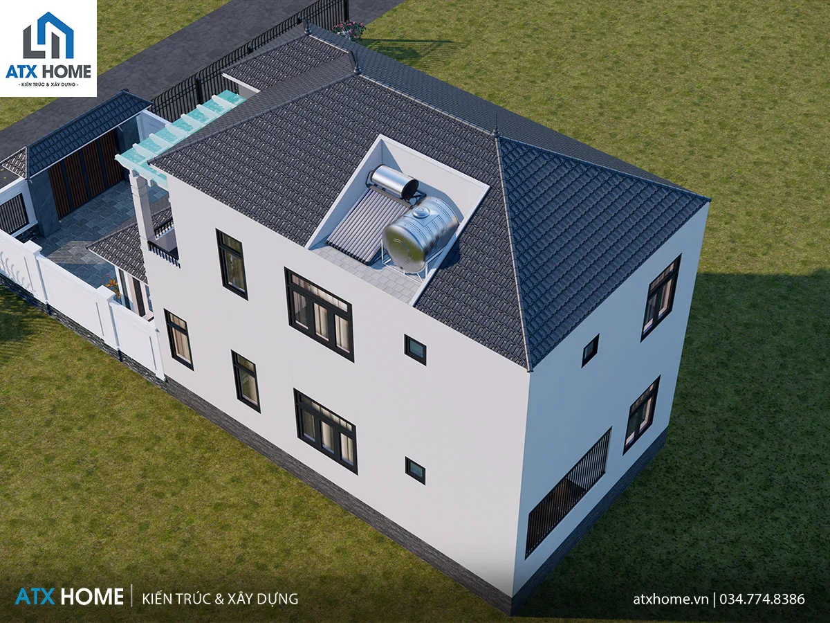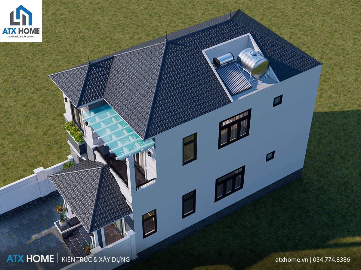 Hệ mái Nhật ngói màu ghi xanh đồng điệu với tổng thể, không chỉ giúp chống nóng, chống thấm tốt mà còn tôn dáng công trình. Sự kết hợp giữa tông trắng sáng chủ đạo và mảng tường ốp ghi xám tạo nên hiệu ứng thị giác hài hòa, sang trọng mà vẫn gần gũi.