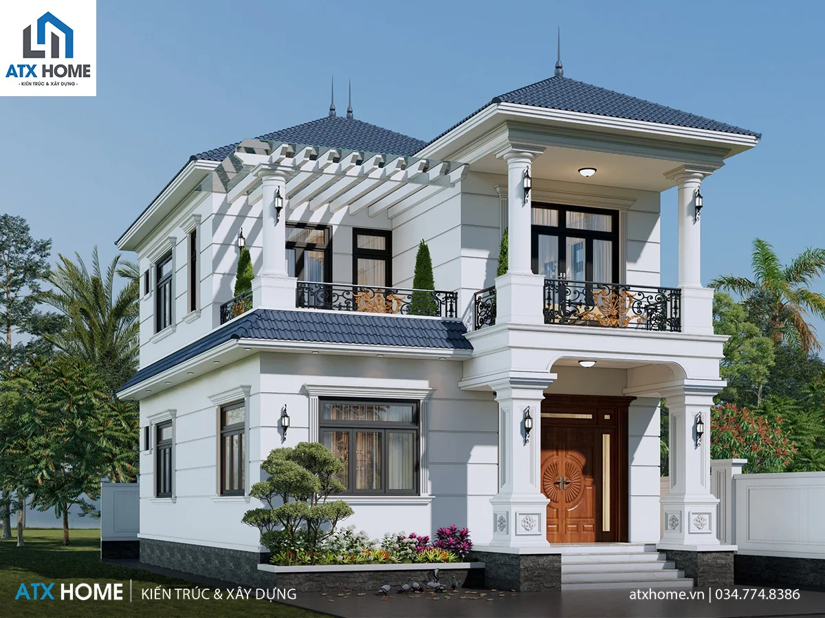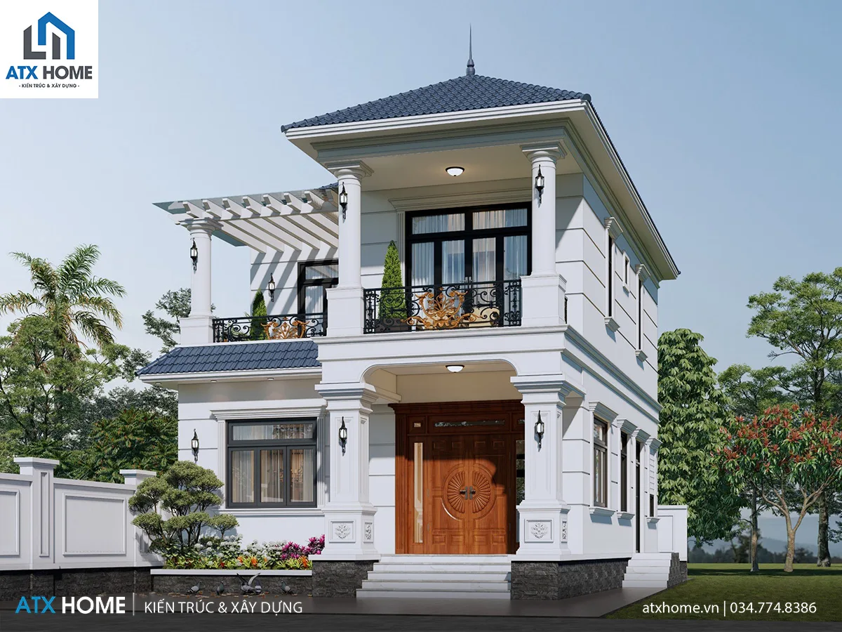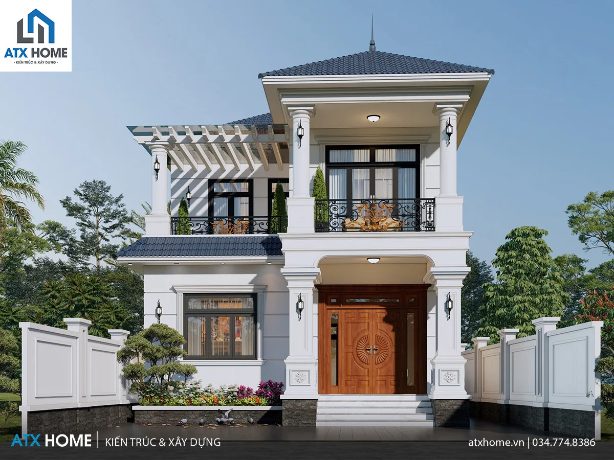 Công trình được thiết kế theo phong cách hiện đại pha nét Á Đông, nổi bật với bố cục đăng đối và tỉ lệ mạch lạc. Tầng 1 được xử lý bằng hệ cột vuông khỏe khoắn, nâng đỡ hiên sảnh và tạo cảm giác vững chãi cho phần chân công trình. Lên đến tầng 2, hệ cột tròn mềm mại được đưa vào thay thế, tạo sự uyển chuyển và thanh thoát hơn. Sự chuyển đổi này giúp công trình vừa mạnh mẽ vừa duyên dáng – một tỷ lệ hình khối được tính toán kỹ lưỡng của kiến trúc sư ATX HOME.