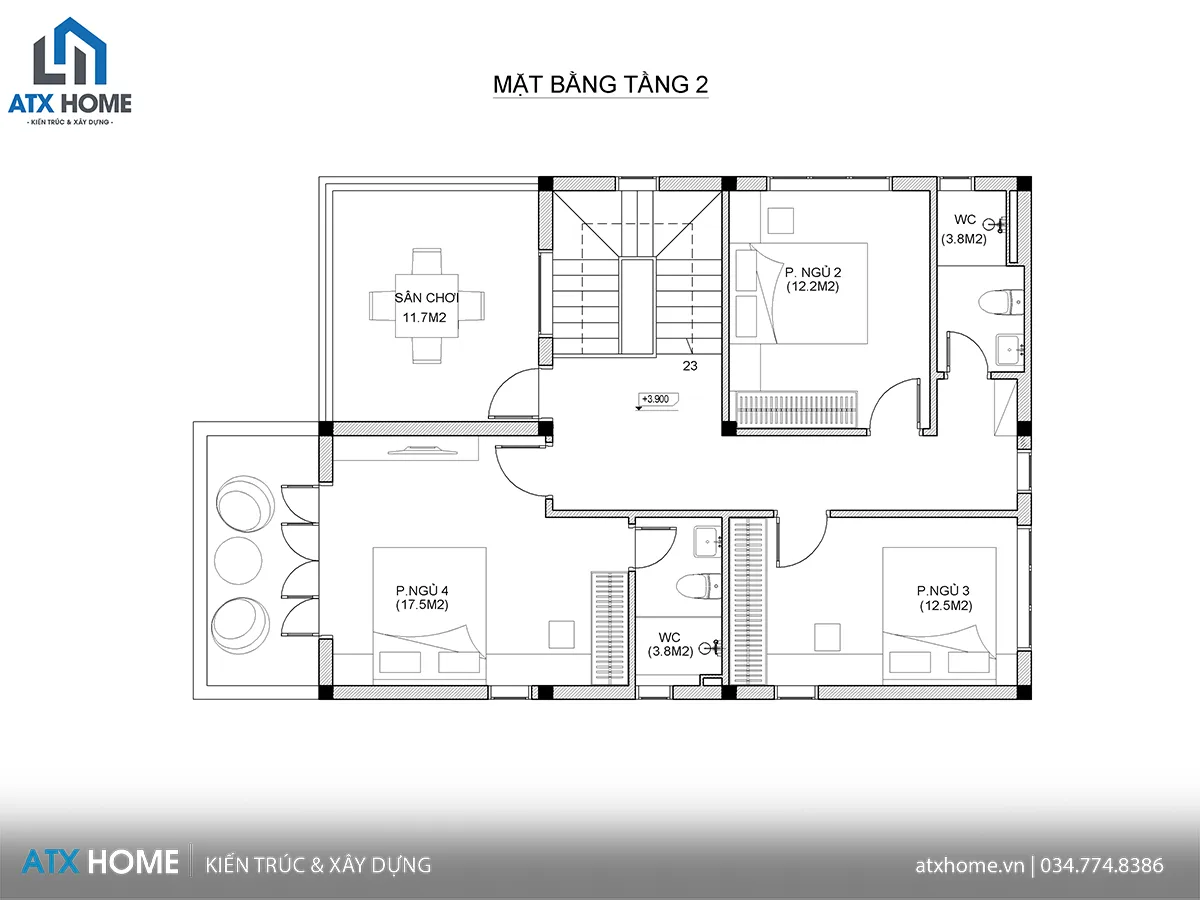 Không gian tầng 2 gồm 3 phòng ngủ, 2 WC và sân chơi (11.7m²):