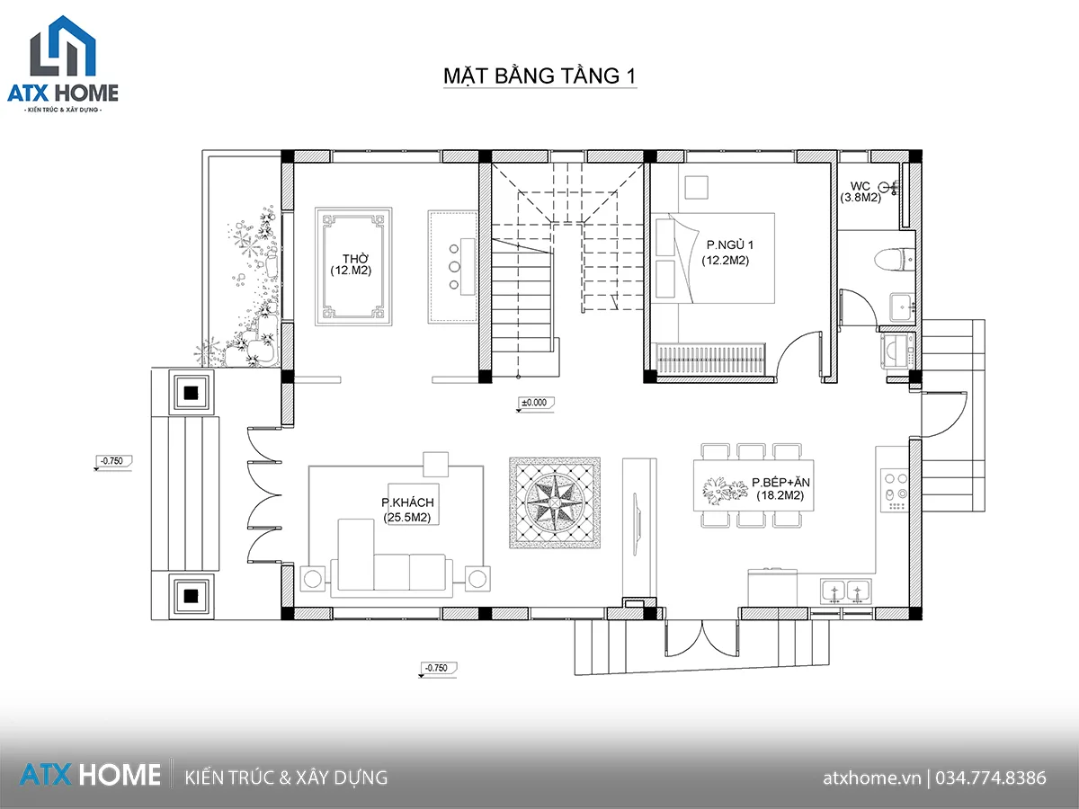 Ngay từ sảnh chính bước vào là phòng khách (25.5m²) rộng rãi, đón sáng tự nhiên từ cửa lớn và ô cửa sổ bên hông. Phía sau là phòng bếp + ăn (18.2m²) nối liền nhau, có cửa phụ ra sân ướt thuận tiện sử dụng. Phòng ngủ 1 (12.2m²) bố trí phía trong, gần WC chung (3.8m²), thuận tiện cho người lớn tuổi. Đặc biệt, phòng thờ (12m²) được đặt ngay tầng trệt, hướng mặt tiền vừa đảm bảo phong thủy, vừa thuận tiện cho sinh hoạt gia đình.