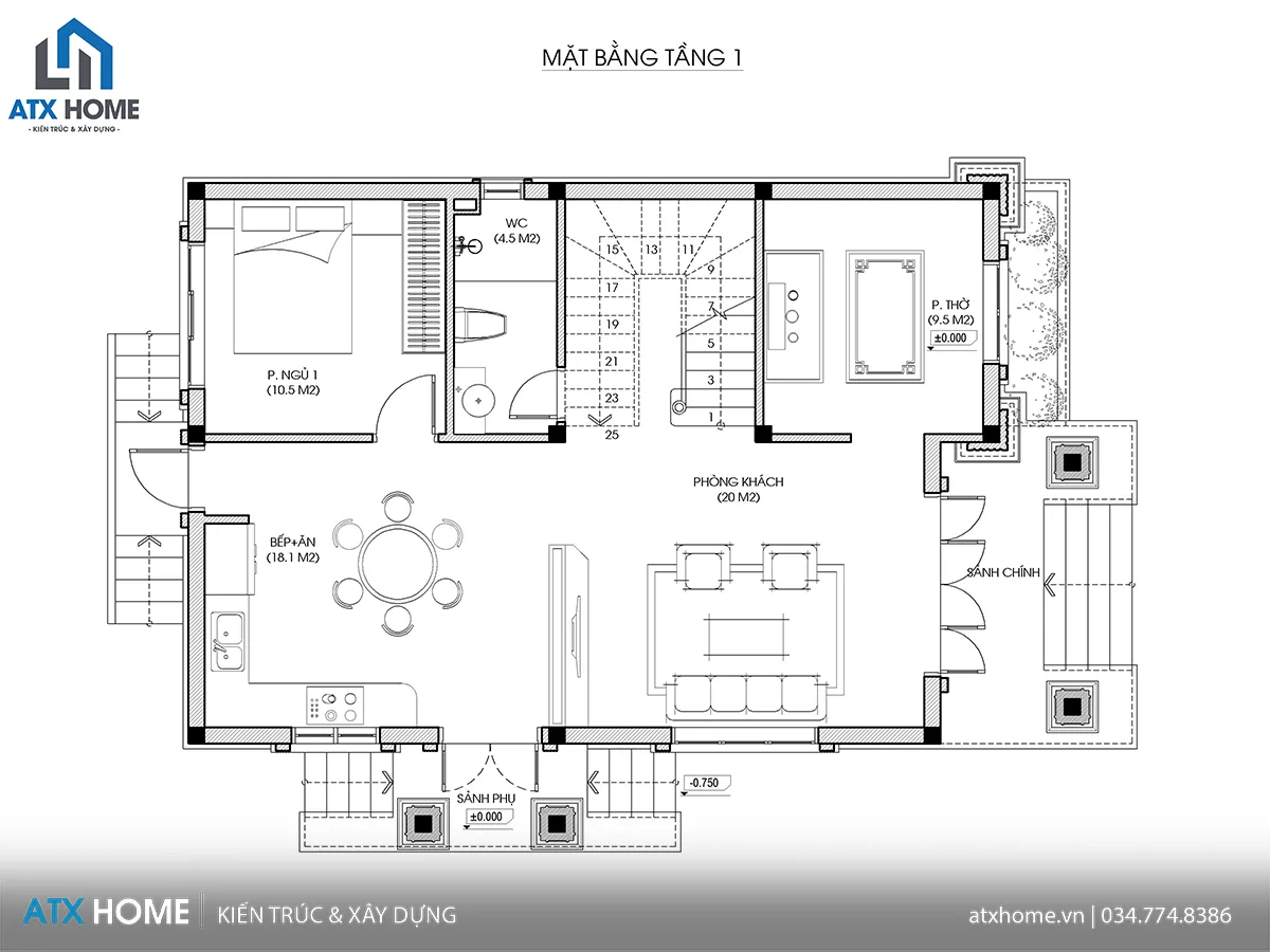 Công năng tầng 1 được ATX HOME bố trí hợp lý, đảm bảo sự thuận tiện và kết nối trong sinh hoạt. Từ sảnh chính bước vào là phòng khách 20m² – nơi tiếp đón khách và sinh hoạt chung của cả gia đình. Bên phải là phòng thờ 9.5m², được bố trí trang trọng và tách biệt, thể hiện sự tôn kính của gia chủ đối với tổ tiên.