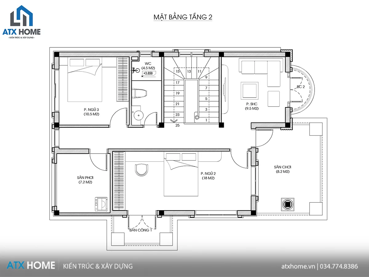 Tầng 2 được bố trí gồm 2 phòng ngủ (10.5m² và 18m²), đều có cửa sổ lớn hướng ra sân chơi và ban công, giúp đón gió và ánh sáng tự nhiên tối đa. Khu vực trung tâm là phòng sinh hoạt chung 9.5m², nơi cả gia đình có thể thư giãn, xem phim hoặc đọc sách cùng nhau.