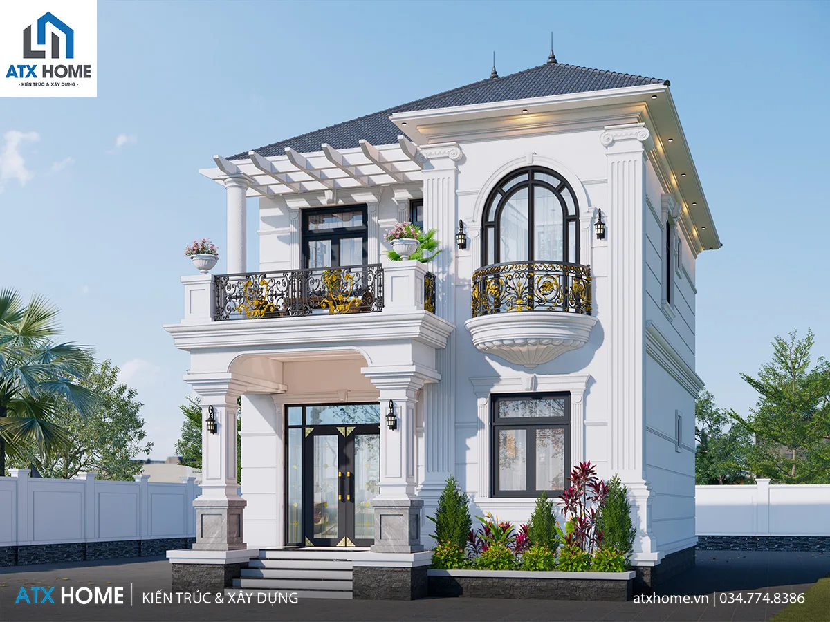 Ngôi nhà gây ấn tượng mạnh với phong cách tân cổ điển nhẹ nhàng, không cầu kỳ hoa mỹ, nhưng vẫn toát lên vẻ sang trọng nhờ những chi tiết phào chỉ tinh tế và đường cong mềm mại. Tông màu trắng sữa chủ đạo kết hợp mái ngói xanh ghi nhã nhặn, điểm xuyết cùng lan can hoa văn sắt nghệ thuật sơn đen viền vàng giúp mặt tiền thêm phần quý phái, nổi bật giữa không gian xung quanh.
