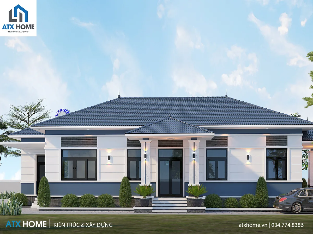 Ngôi nhà sử dụng tông trắng chủ đạo kết hợp lam xanh xám trầm, giúp tổng thể trở nên thanh lịch và sang hơn dưới ánh nắng. Hệ mái Nhật xanh than dốc nhẹ, kết cấu cân đối mang lại vẻ bề thế mà vẫn mềm mại, phù hợp khí hậu Việt Nam, giúp thoát nước nhanh và chống nóng tốt.