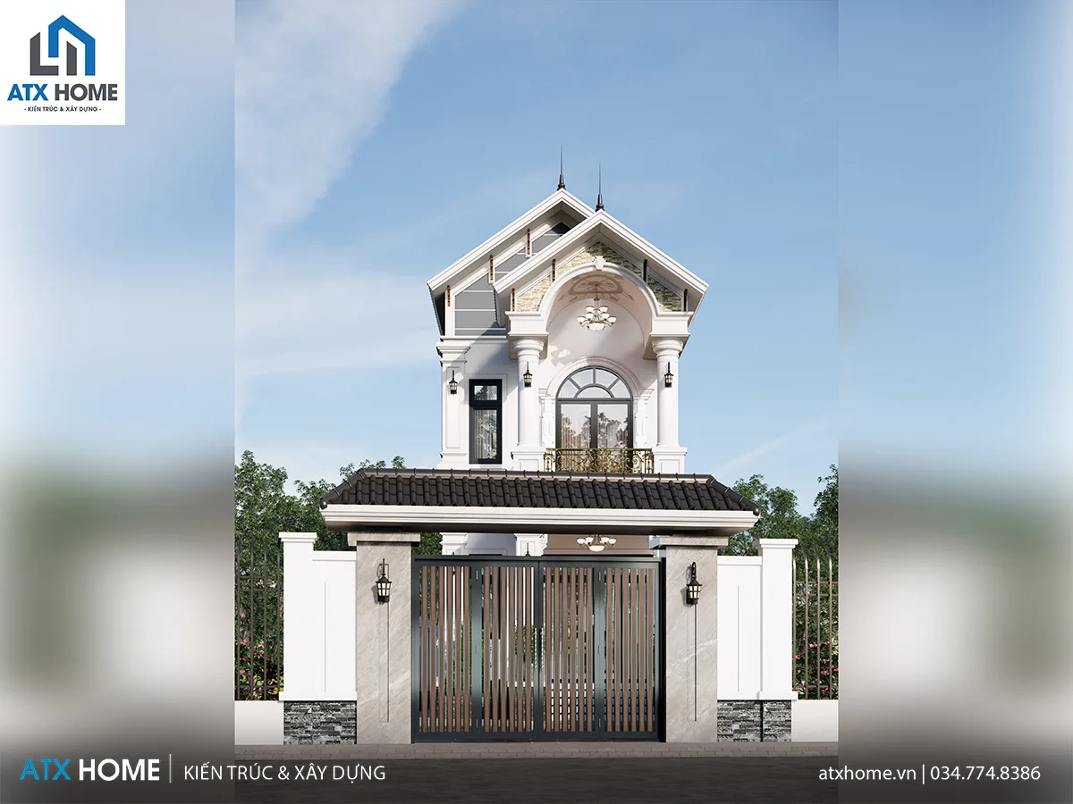 Công trình gây ấn tượng mạnh ngay từ cái nhìn đầu tiên nhờ kiến trúc tân cổ điển nhẹ nhàng, kết hợp hài hòa cùng mái Thái dốc màu xanh than sang trọng. Mặt tiền được thiết kế đối xứng, các chi tiết phào chỉ trang trí tinh tế, kết hợp với hệ cột vuông tầng 1 và cột tròn tầng 2, lan can hoa văn mạ vàng, giúp ngôi nhà trở nên uy nghi mà vẫn giữ được nét mềm mại, thanh nhã.