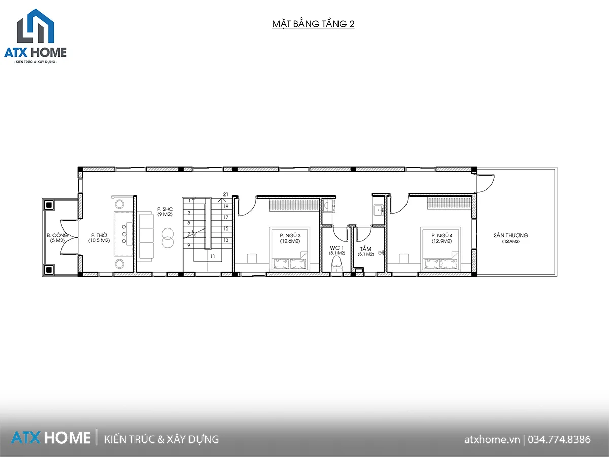 • Sân thượng (12.9m²): Là nơi lý tưởng để trồng cây, phơi đồ hoặc thư giãn, ngắm cảnh.