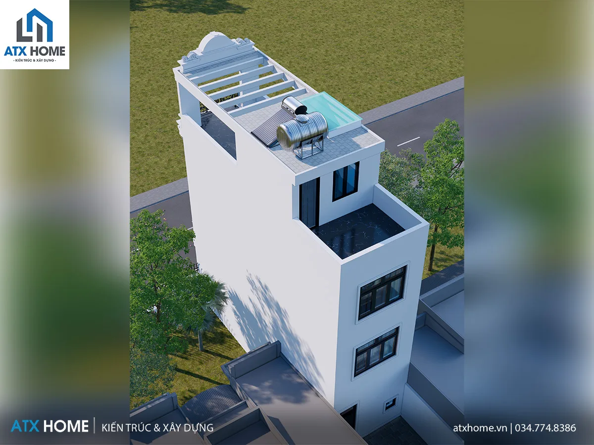 Lan can sắt nghệ thuật với họa tiết cổ điển được sơn tĩnh điện đen, vừa đảm bảo an toàn, vừa góp phần tôn lên vẻ đẹp tinh tế cho tổng thể mặt tiền. Tầng thượng mở thoáng với hệ lam trắng thanh mảnh, giúp đón nắng nhẹ và gió trời, tạo nên không gian thư giãn lý tưởng cho cả gia đình.