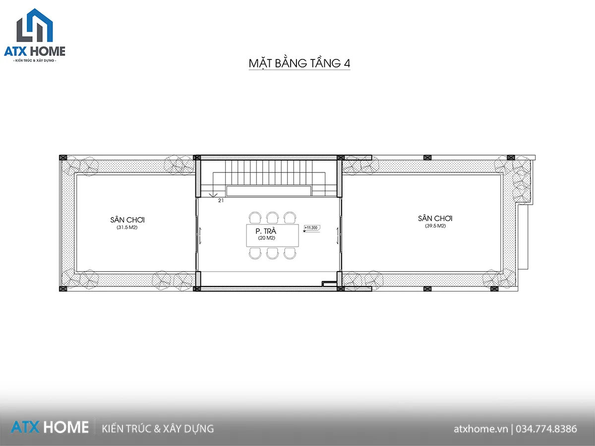 Không gian trên cùng được bố trí phòng trà 20m² ở giữa, hai bên là sân chơi rộng – nơi lý tưởng để trồng cây xanh, hóng gió hay tổ chức những buổi trò chuyện gia đình.