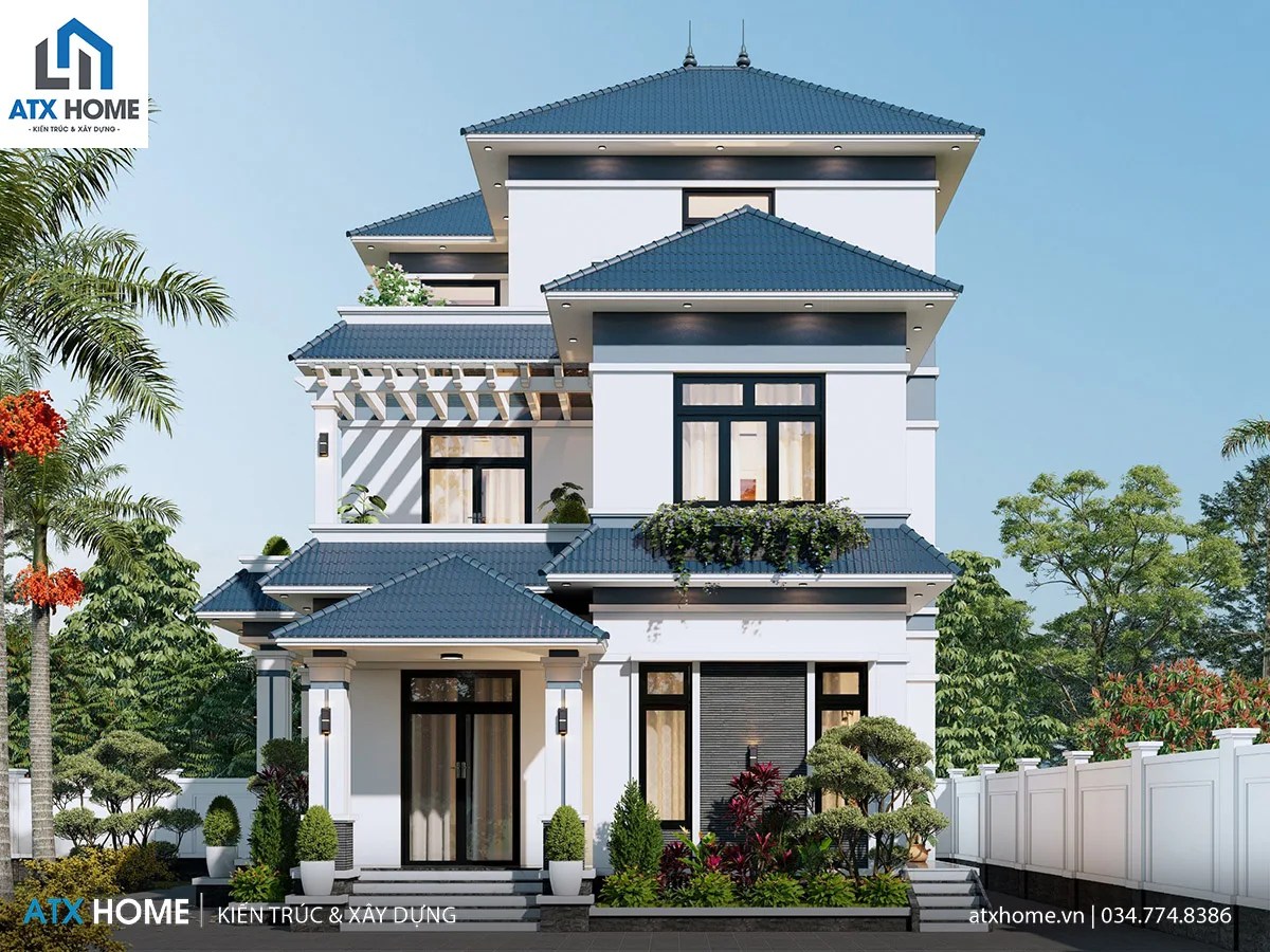 Ngôi nhà mang dáng dấp kiến trúc mái Nhật hiện đại, kết hợp hài hòa giữa màu trắng chủ đạo và sắc xanh than của mái ngói, tạo nên vẻ đẹp tinh tế và thanh lịch. Các khối nhà được thiết kế giật cấp khéo léo, giúp tổng thể công trình không bị nặng nề mà vẫn thể hiện sự bề thế.