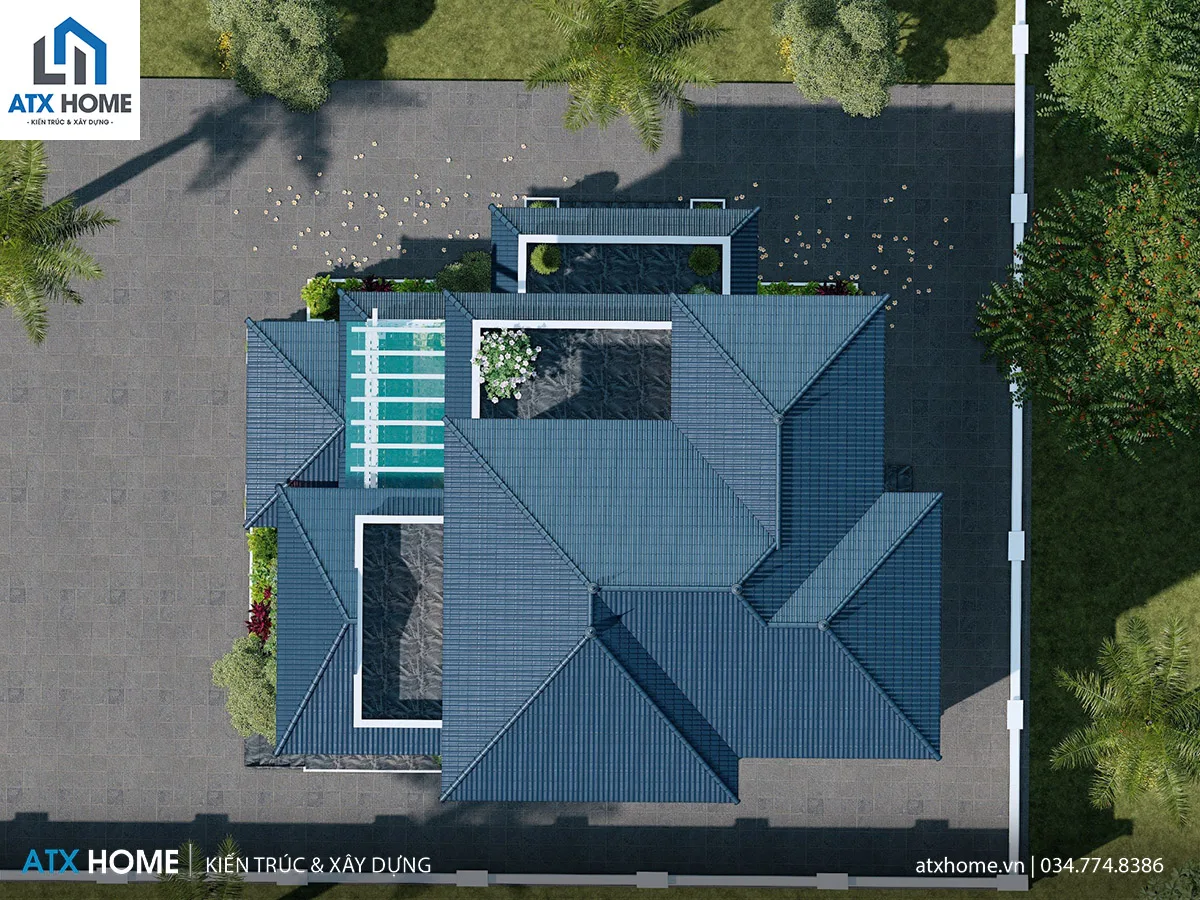 Hệ mái Nhật là điểm nhấn nổi bật với độ dốc vừa phải, vươn nhẹ ra bốn phía, mang lại cảm giác cân bằng, mềm mại. Kiểu mái này không chỉ đảm bảo khả năng thoát nước tốt, chống nóng hiệu quả, mà còn mang lại ý nghĩa phong thủy tích cực tượng trưng cho sự bình an và sung túc.