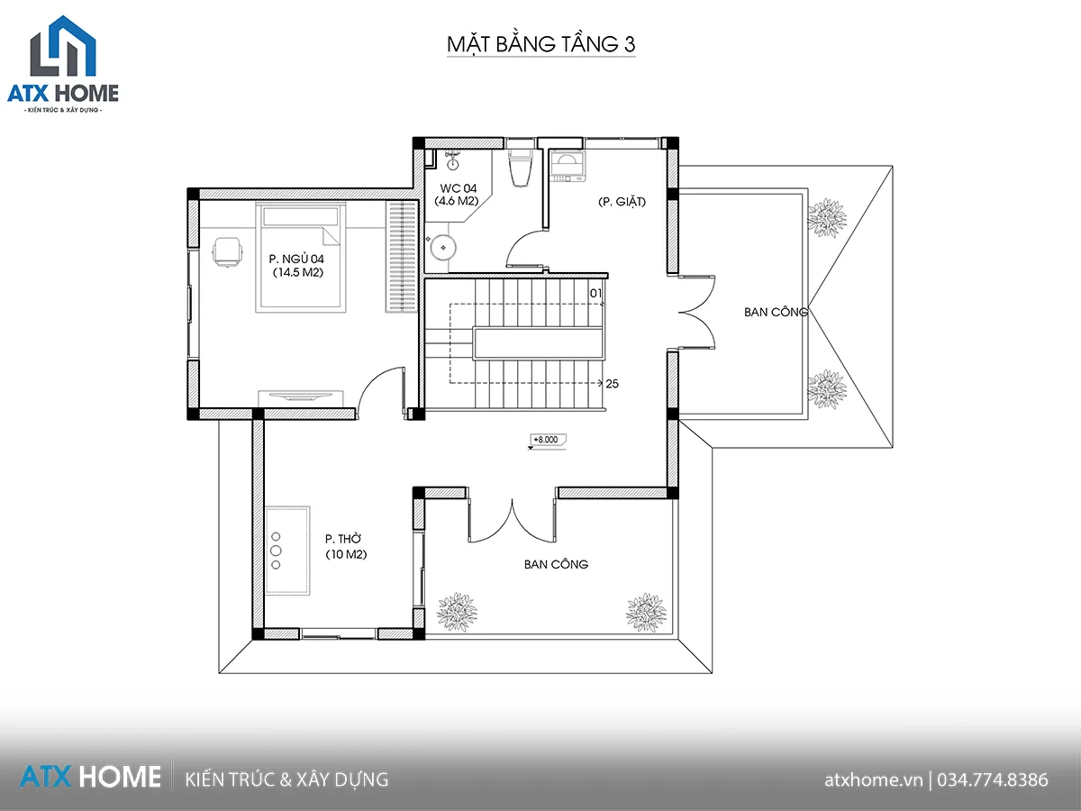 Phòng thờ (10m²): Đặt ở vị trí cao nhất, hướng ra ban công, thể hiện sự tôn kính và phong thủy tốt.