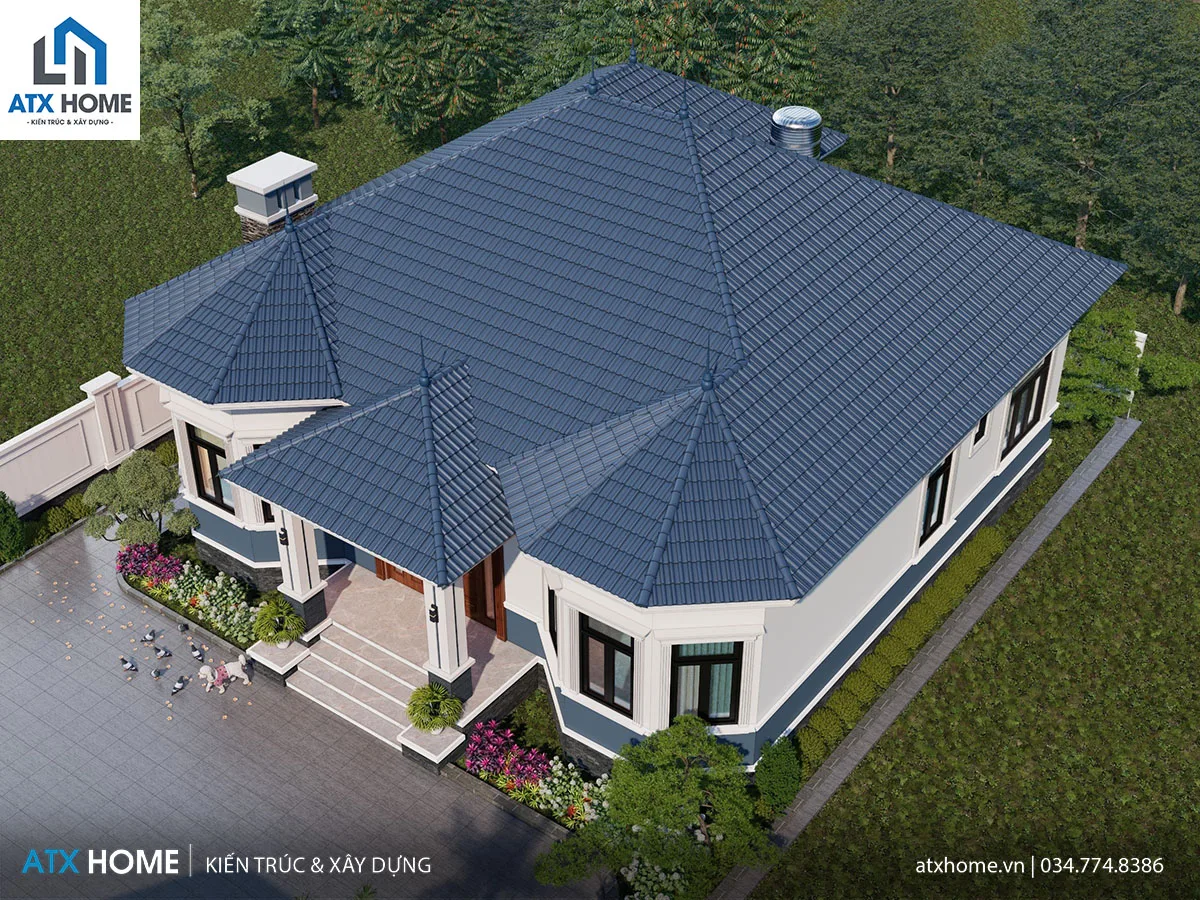 Phần mái được thiết kế giật cấp nhẹ, mở rộng theo nhiều hướng, không chỉ mang lại vẻ cân đối mà còn giúp công trình có chiều sâu và bề thế hơn. Sử dụng ngói màu xanh than, kết hợp với tông tường trắng và ghi trung tính, mang đến cảm giác thanh lịch và sang trọng. Mái Nhật có độ dốc vừa phải, giúp thoát nước nhanh, chống thấm tốt, đồng thời giữ không gian mát mẻ quanh năm, rất phù hợp với khí hậu miền núi Hòa Bình.