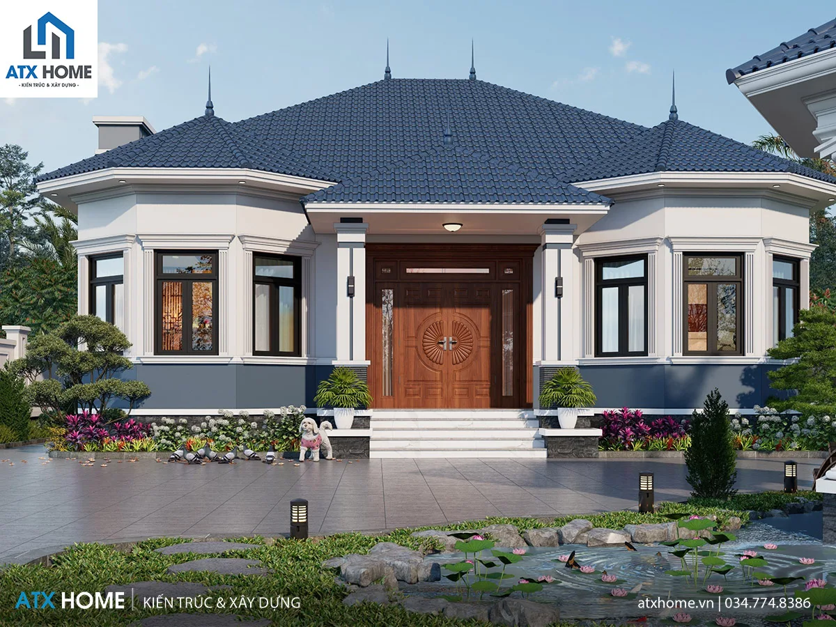 Khuôn viên được quy hoạch thông thoáng với hệ tiểu cảnh hồ nước và chòi nghỉ ngoài trời – nơi gia chủ có thể thưởng trà, đọc sách hay tận hưởng không khí trong lành mỗi sớm mai. Các bồn hoa, cây cảnh được bố trí dọc theo mặt tiền và xung quanh tường rào, giúp ngôi nhà như hòa mình vào thiên nhiên. Tổng thể không chỉ đẹp mắt mà còn mang lại cảm giác an yên, thư thái, rất đúng tinh thần “sống nghỉ dưỡng trong chính ngôi nhà của mình”.