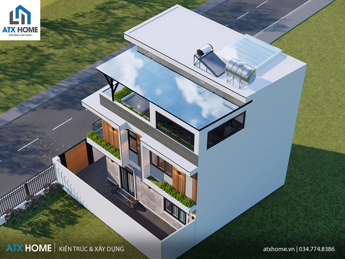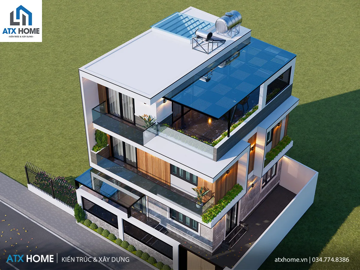 Điểm nhấn đặc biệt của công trình nằm ở ban công kính lớn liên tầng, phủ cây xanh mềm mại, giúp tổng thể công trình vừa hiện đại vừa gần gũi với thiên nhiên. Tầng thượng được bố trí mái che lam thép sơn tĩnh điện không chỉ tạo điểm nhấn thẩm mỹ mà còn giúp giảm nắng nóng, mang lại cảm giác mát mẻ quanh năm.