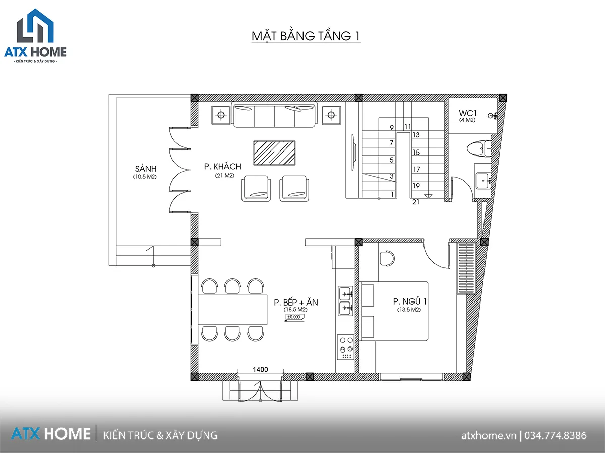 Bao gồm phòng khách (21m²) liên thông bếp ăn (18.5m²), giúp không gian mở rộng và ánh sáng dễ dàng lan tỏa. Một phòng ngủ nhỏ 13.5m² được bố trí ở góc kín đáo, thuận tiện cho ông bà hoặc khách nghỉ lại. Phía sau là WC chung, thiết kế gọn gàng và thuận tiện sử dụng.