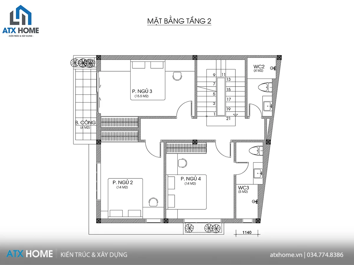 Tầng này bố trí ba phòng ngủ (14–15.5m²), mỗi phòng đều có cửa sổ lớn, đảm bảo thông thoáng và đón sáng tự nhiên. Trong đó phòng ngủ 4 có WC riêng thuận tiện. Nhà vệ sinh chung được bố trí hợp lý ở cuối tầng giúp các thành viên sử dụng dễ dàng mà vẫn đảm bảo riêng tư.
