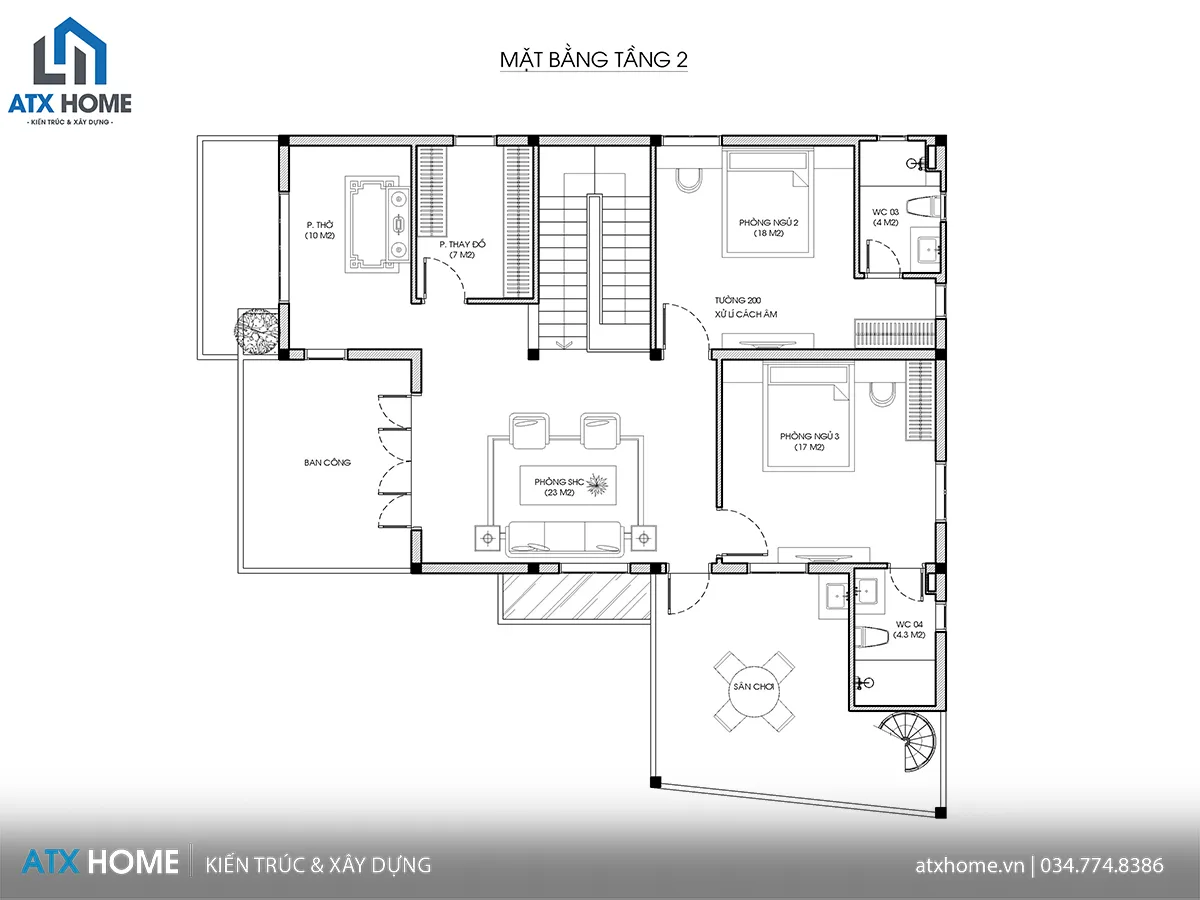 Phòng sinh hoạt chung (23 m²): Trung tâm của tầng, là nơi quây quần, đọc sách hoặc giải trí.