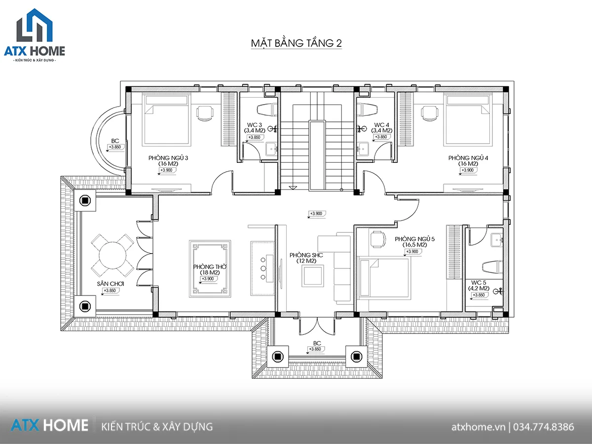 Trên tầng hai là 3 phòng ngủ, trong đó phòng ngủ chính có diện tích lớn hơn, kèm khu vực thay đồ, WC riêng. Phòng sinh hoạt chung được đặt tại vị trí trung tâm, kèm theo ban công là nơi lý tưởng để cả nhà cùng thư giãn sau những ngày dài. Phòng thờ trang trọng nằm phía trước, hướng ra ban công, đảm bảo phong thủy và sự tôn nghiêm.